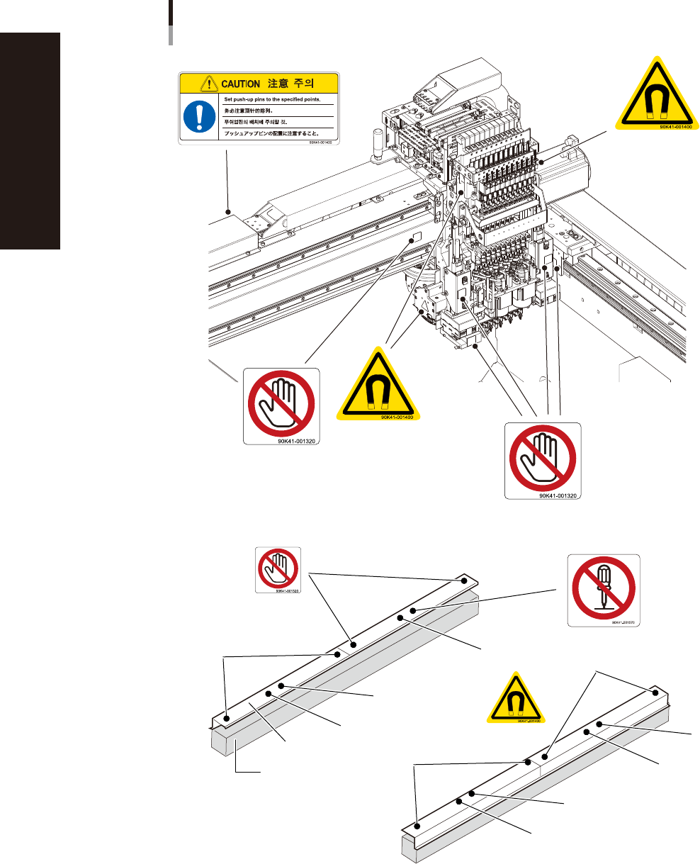 viii Safety instructions n Label positions W arning/caution labels Interior ■ X-axis frame section ■ Y -axis linear scale 1. Never touch. 1 2 3 2. Disassembly prohibited. 3. Caution on strong magnetic fields 1 3 2 1 3 2 …