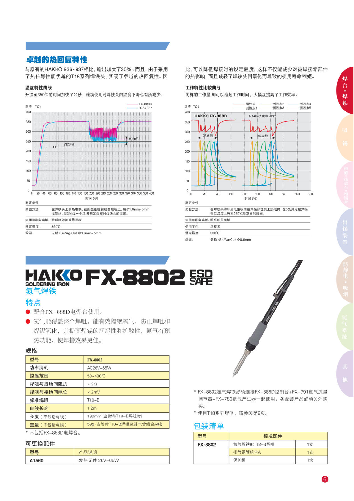 卓越 的热回 复特性 与 原有的 HAKKO 936 ・ 937 相比, 输出 加大了 30%。 而且, 由 于采用 了热传 导性能 优越的 T18 系列焊 铁头, 实现 了卓越 的热回 复性。 因 温度特 性曲线 升温至 350℃ 的时间 加快了 20 秒, 连 续使用 时焊铁 头的温 度下降 也有所 减少。 温度 (℃) FX-888D 936/937 测 定条件 试验 方法: 在 焊铁头 上装热 电偶, 在酚醛 纸镀铜 膜叠层 板…