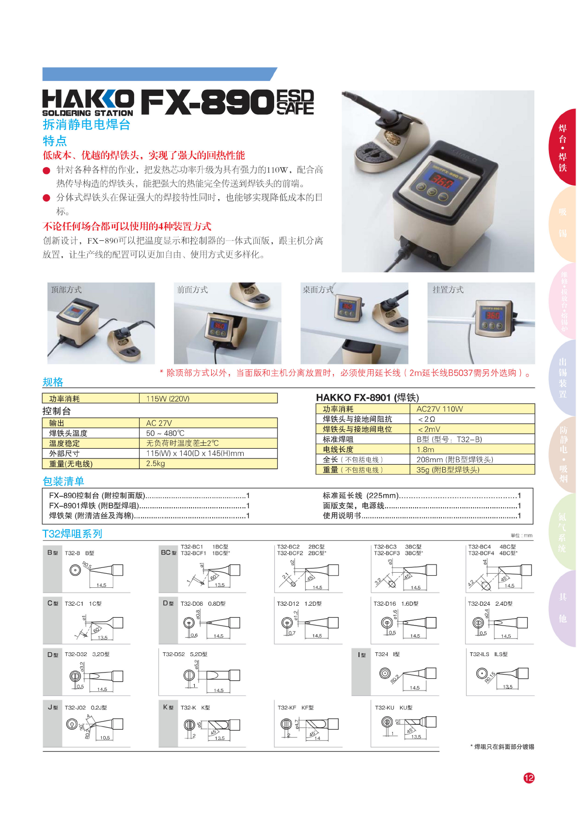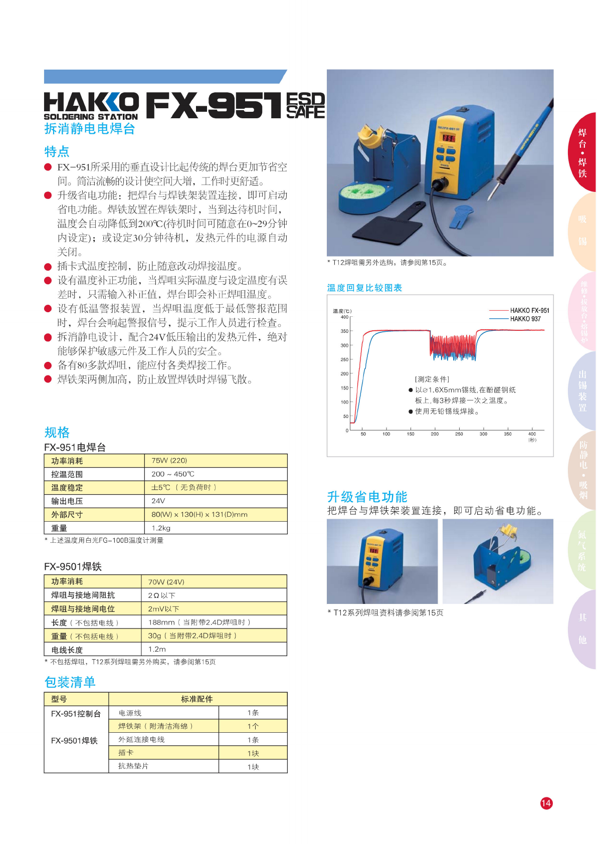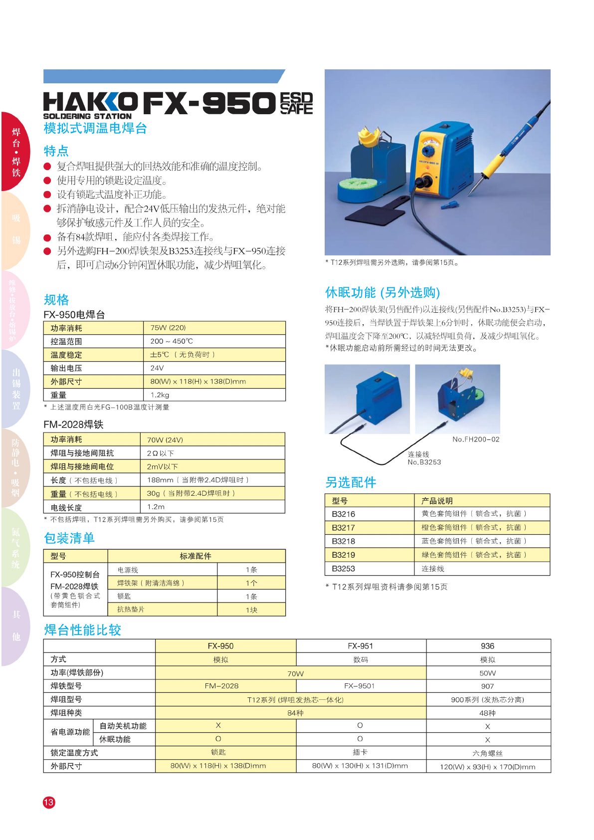 HAI«pFX-95O^ 模拟 式调温 电焊台 特点 • 复 合焊咀 提供强 大的回 热效能 和准确 的温度 控制。 • 使用专 用的锁 匙设定 温度。 • 设有锁 匙式温 度补正 功能。 • 拆 消静电 设计, 配合 24V 低 压输出 的发热 元件, 绝对能 够 保护敏 感元件 及工作 人员的 安全。 • 备有 84 款 焊咀, 能 应付各 类焊接 工作。 • 另 外选购 FH- 200 焊 铁架及 B3253 连 接线与 FX- …