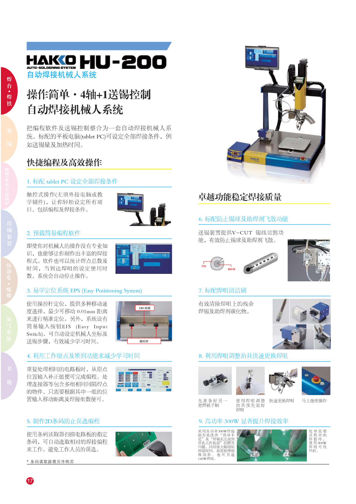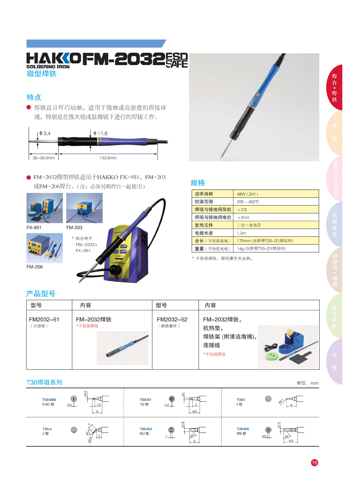 HAKCOFM-2O32^ SOLDERING IRON 「匚 微 型焊铁 特点 • 焊铁设 计纤巧 幼细, 适 用于微 细或高 密度的 焊接环 境, 特别 是在放 大镜或 显微镜 下进行 的焊接 工作。 • FM- 2032 微 型焊铁 适用于 HAKKO FX- 951, FM-203 或 FM- 206 焊台。 (注: 必须 另购焊 台一起 使川) 规格 功 率消耗 48W ( 24V ) 控 温范围 200 450℃ 焊咀 与接…