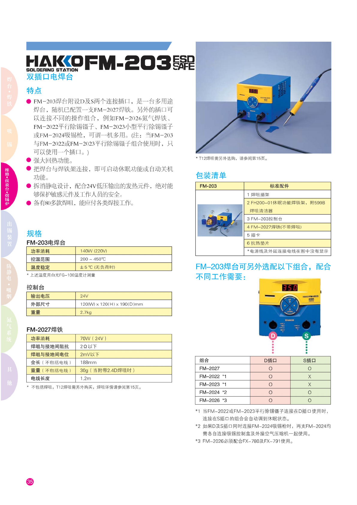 hakcofm-2O3^ SOLDERING STATION J 双插口 电焊台 特点 • FM-203 焊 台附设 D 及 S 两 个连接 插口, 是一台 多用途 焊台, 随 机已配 置一支 FM-2027 焊铁。 另外的 插口可 以连 接不同 的操作 组合, 例如 FM-2026 氮气 焊铁、 FM-2022 平 行除锡 镶子、 FM-2023 小型 平行除 锡镶子 或 FM-2024 吸 锡枪, 可 谓一机 多用。 (注: 当 F…