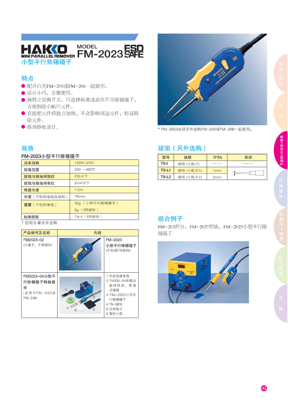 MINI PARALLEL REMOVER 小型 平行除 锡镜子 MODEL ECO FM-2023 瘫 特点 • 配 合白光 FM- 203 或 FM- 206 一起 使用。 • 设计 小巧, 方便 使用。 • 独特 之切换 开关, 可选择 标准或 逆向开 合除锡 镶子, 方 便拆除 小贴片 元件。 • 直接 把元件 焊接点 加热, 不会影 响周边 元件, 轻易拆 除 元件。 • 拆 消静电 设计。 * FM-2023 必 须另夕 卜…