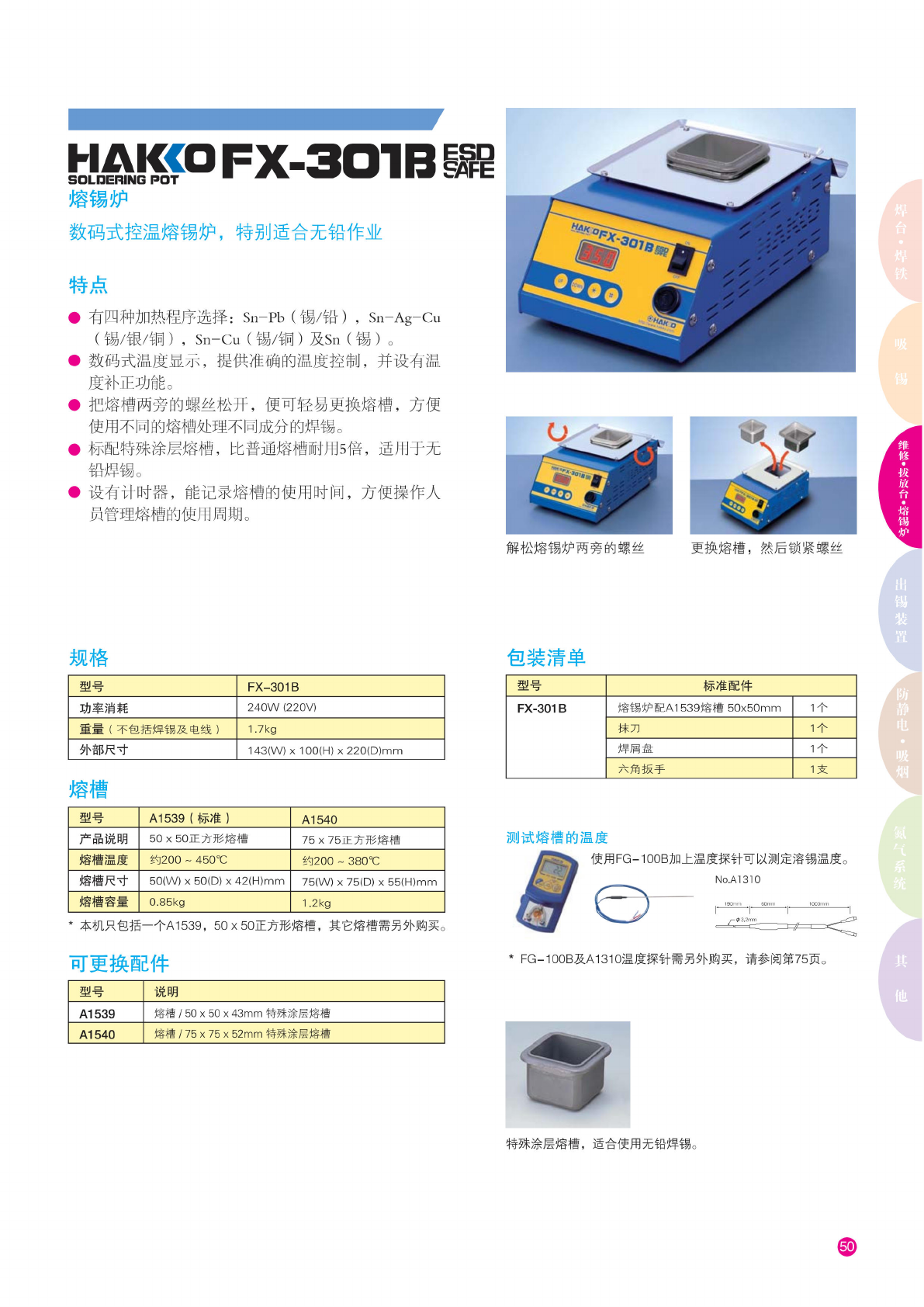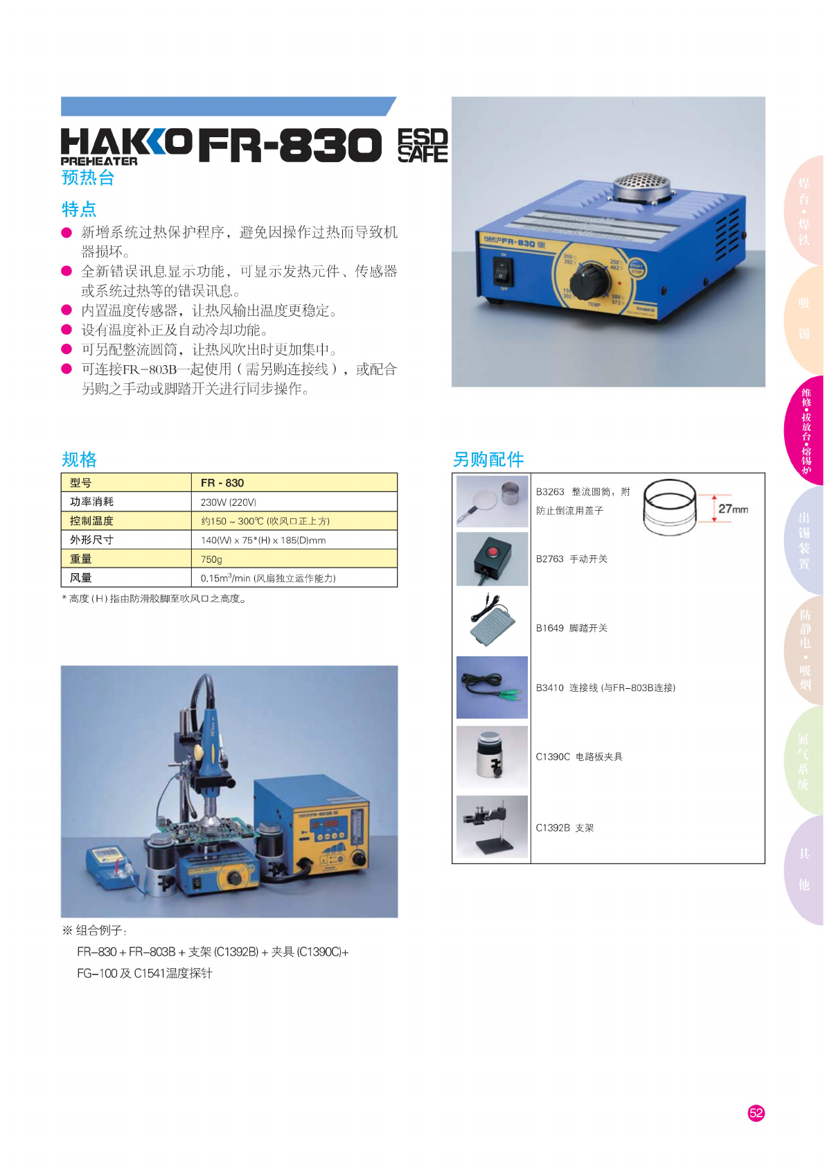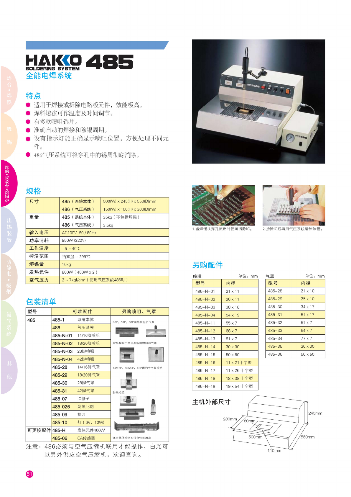 HAKCO 485 SOLDERING SYSTEM 全能电 焊系统 特点 • 适用 于焊接 或拆除 电路板 元件, 效能 极高。 • 焊料 熔流可 作温度 及时间 调节。 • 有多 款喷咀 选用。 • 准 确自动 的焊接 和除锡 周期。 • 设有指 示灯能 正确显 示喷咀 位置, 方 便处理 不同元 件。 • 486 气压 系统可 将穿孔 中的锡 屑彻底 消除。 规格 尺寸 485 ( 系 统本体 ) 486 ( 气 压系统 ) 50…