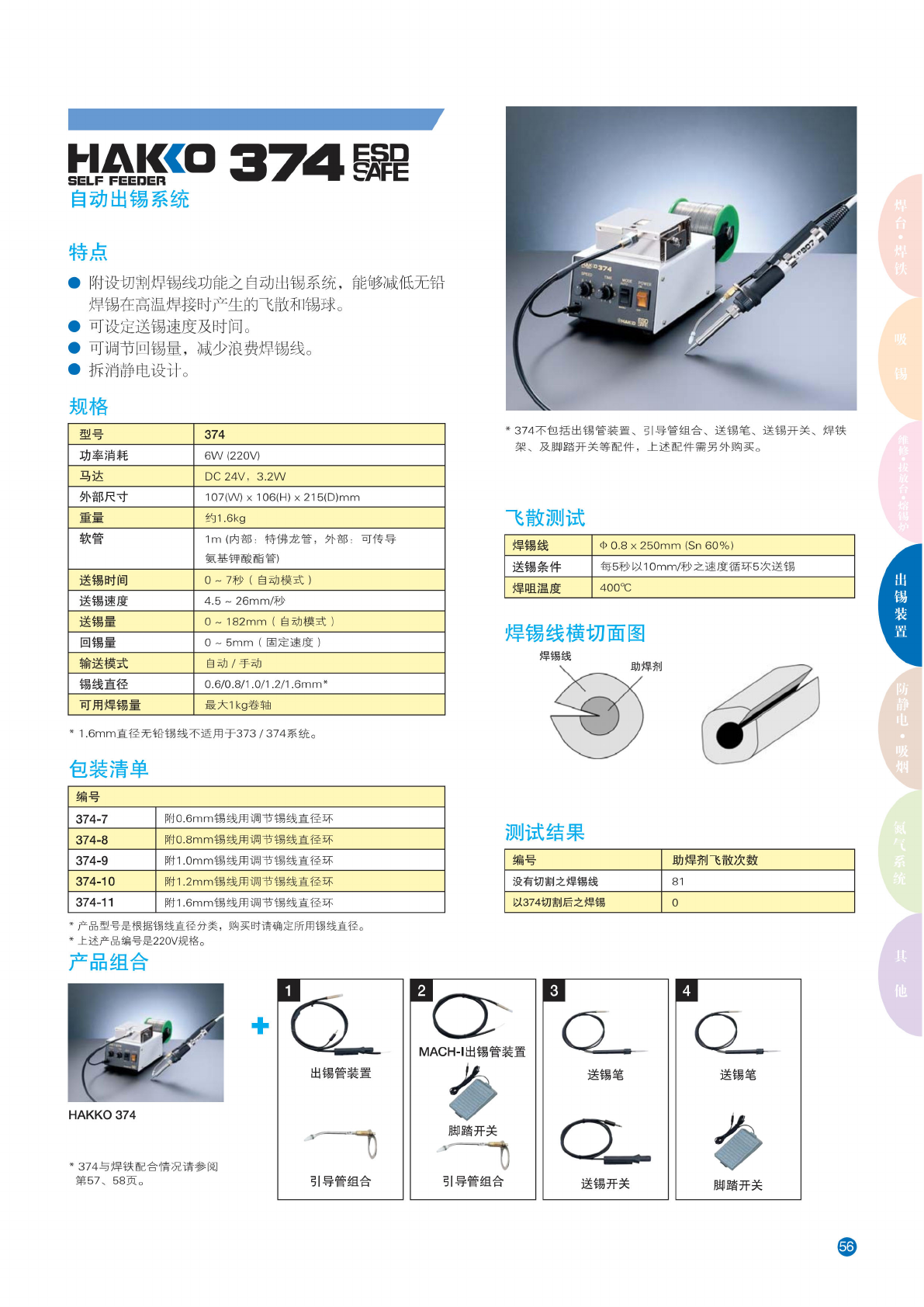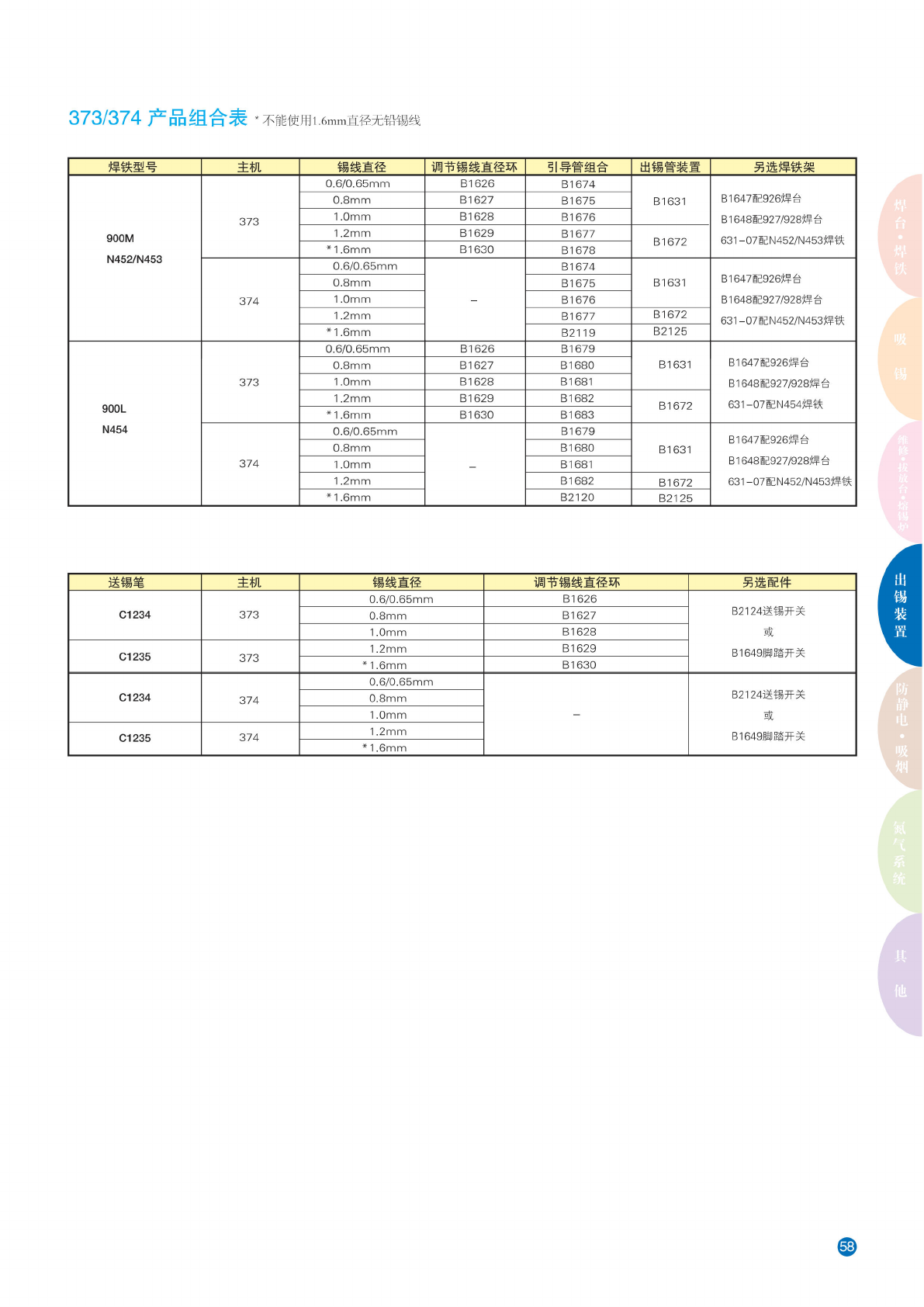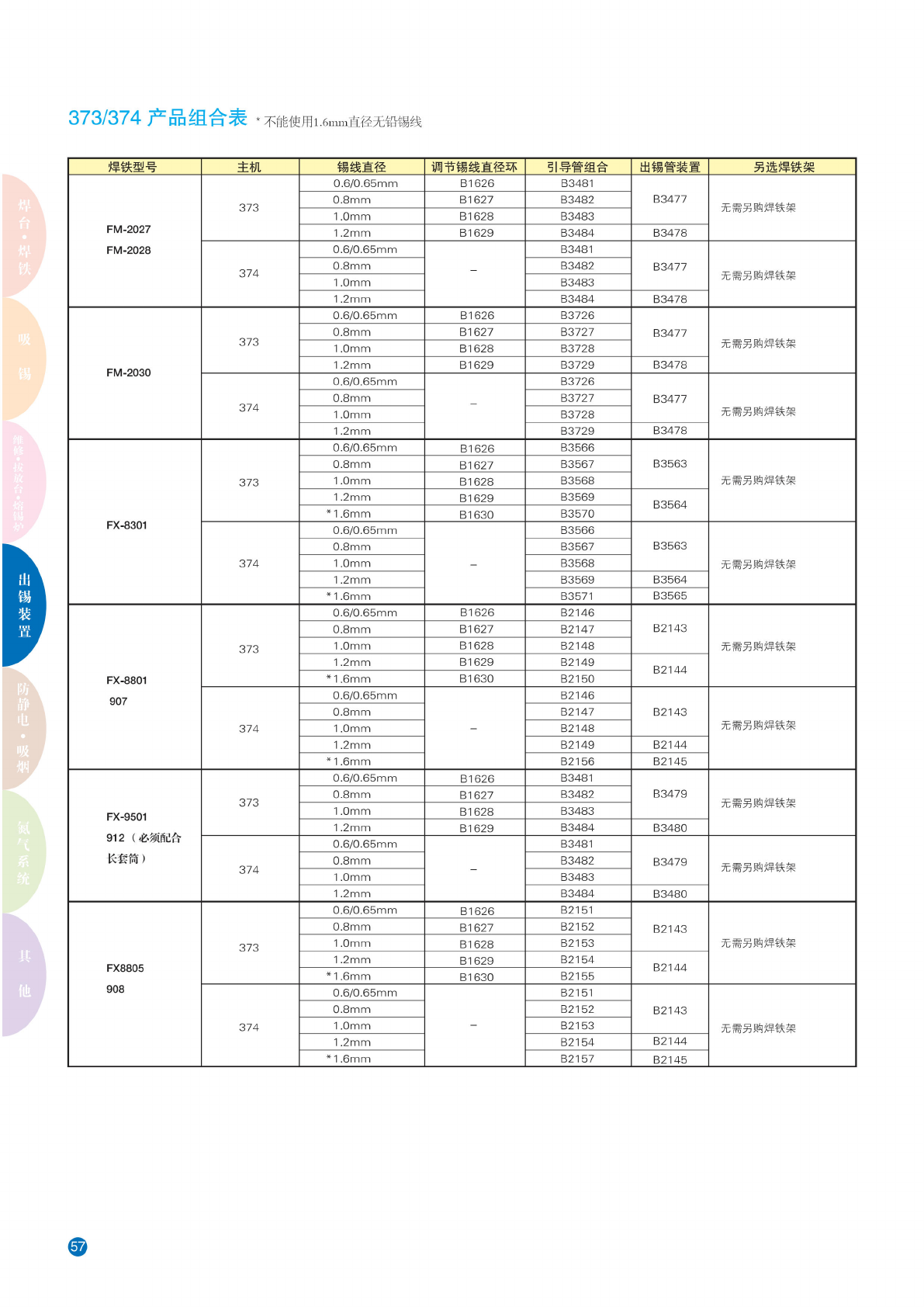 373/374 产品 组合表 * 不 能使用 1 .6mm 直径无 铅锡线 焊 铁型号 主机 锡 线直径 调 节锡线 直径环 引导 管组合 出锡 管装置 另选 焊铁架 FM-2027 FM-2028 373 0.6/0. 65mm B1626 B3481 B3477 无 需另购 焊铁架 0.8mm B1627 B3482 1 .0mm B1628 B3483 1 .2mm B1629 B3484 B3478 374 0.6/0. 65m…