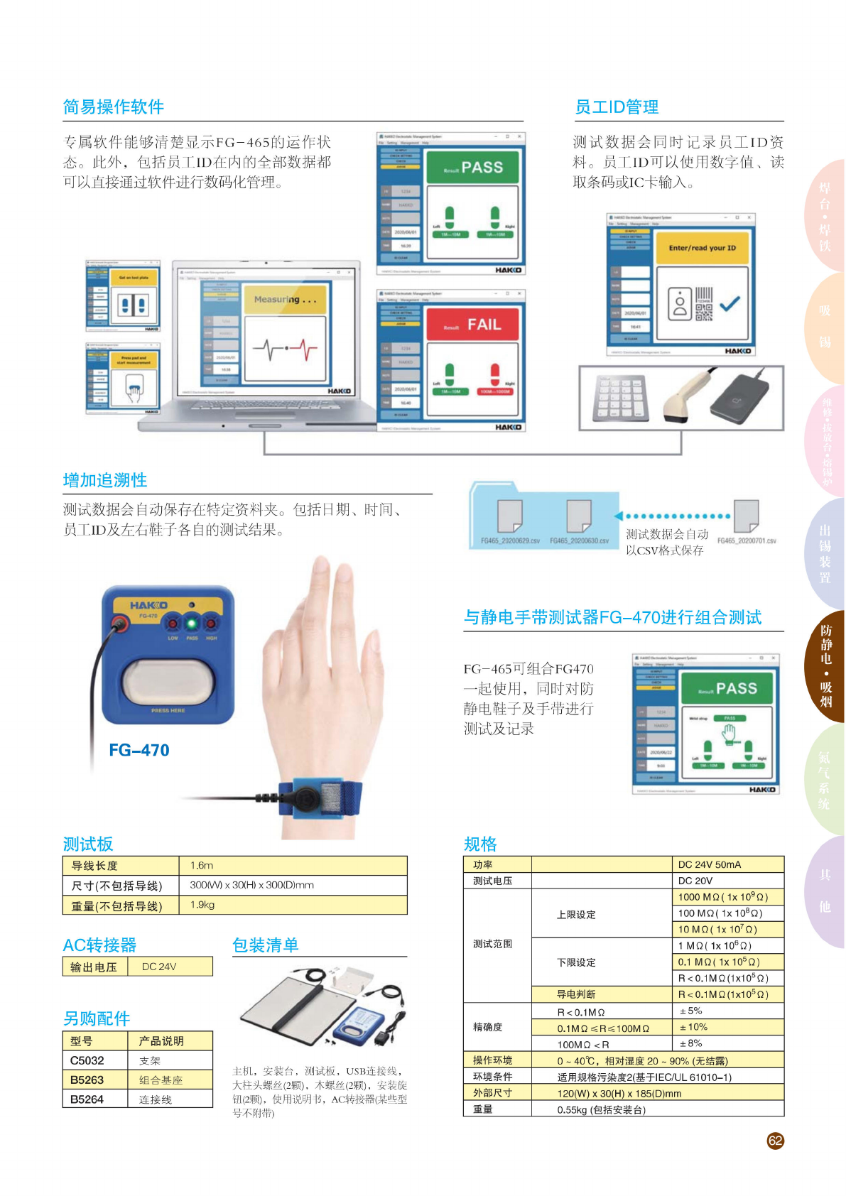 简易操 作软件 员工 ID 管理 歪 专 属软件 能够清 楚显示 FG-465 的 运作状 态。 此外, 包 括员工 ID 在内 的全部 数据都 可以直 接通过 软件进 行数码 化管理 测试 数据会 同时记 求员工 ID 资 料。 员工 ID 可以 使用数 字值、 读 取 条码或 IC 卡 输入。 增加 追溯性 测 试数据 会自动 保存在 特定资 料夹。 包括 日期、 时间、 员工 ID 及左右 鞋子各 自 的测试 结果。 FG-470…
