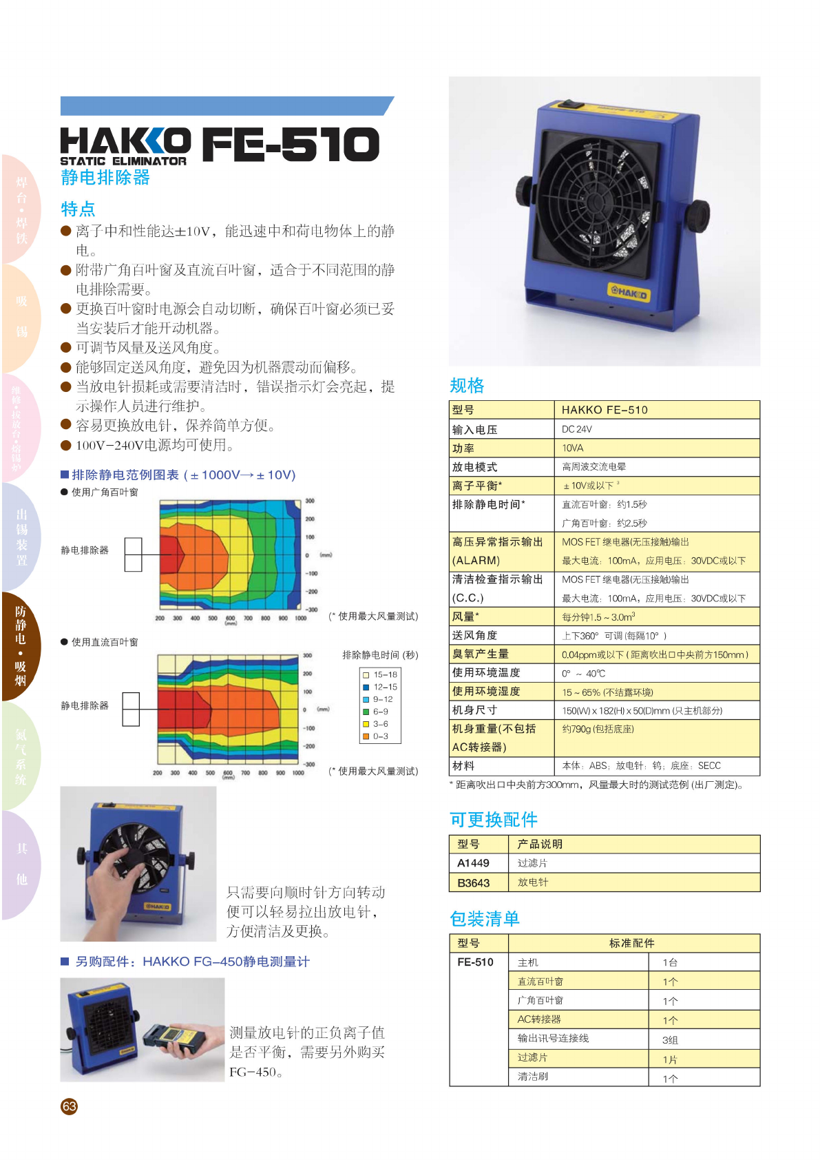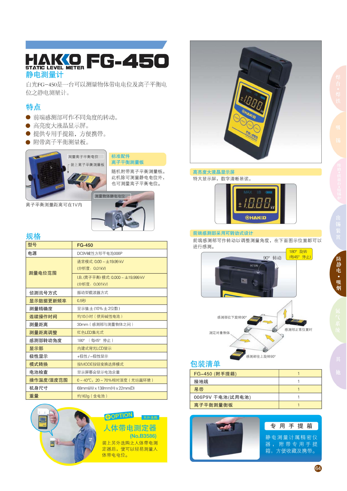 hakco FG-45O STATIC LEVEL METER 青事由 测量计 白光 FG- 45() 是 一台可 以测量 物体带 电电位 及离子 平衡电 位之 静电测 量计。 特点 • 前端感 测部可 作不同 角度的 转动。 • 高 亮度大 液晶显 示屏。 • 提供 专用手 提箱, 方便 携带。 • 附 带离子 平衡测 量板。 装上离 子平衡 测量板 离 子平衡 测量距 离可在 1V 内 随机附 带离子 平衡测 量板。 此机除 可测量…
