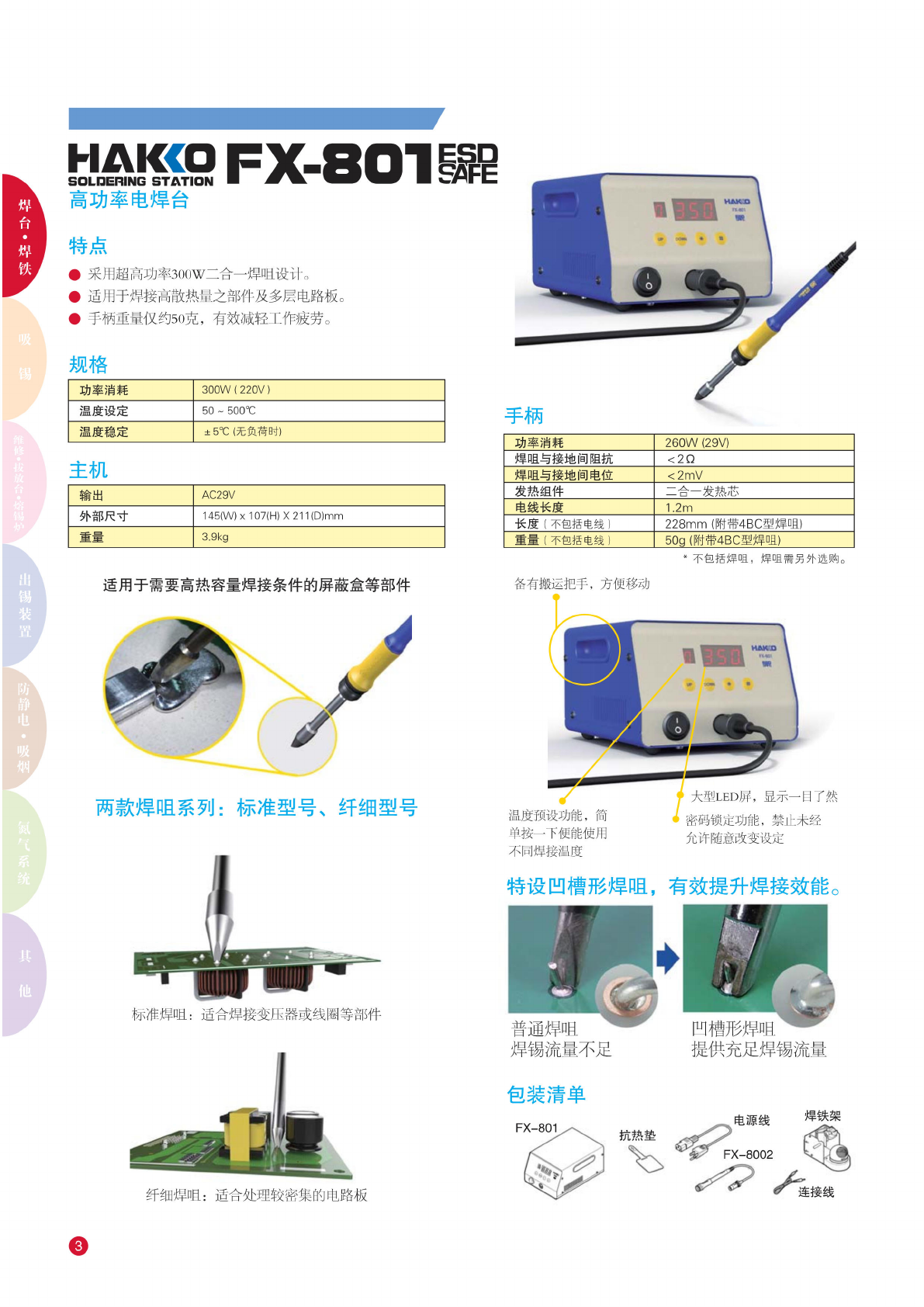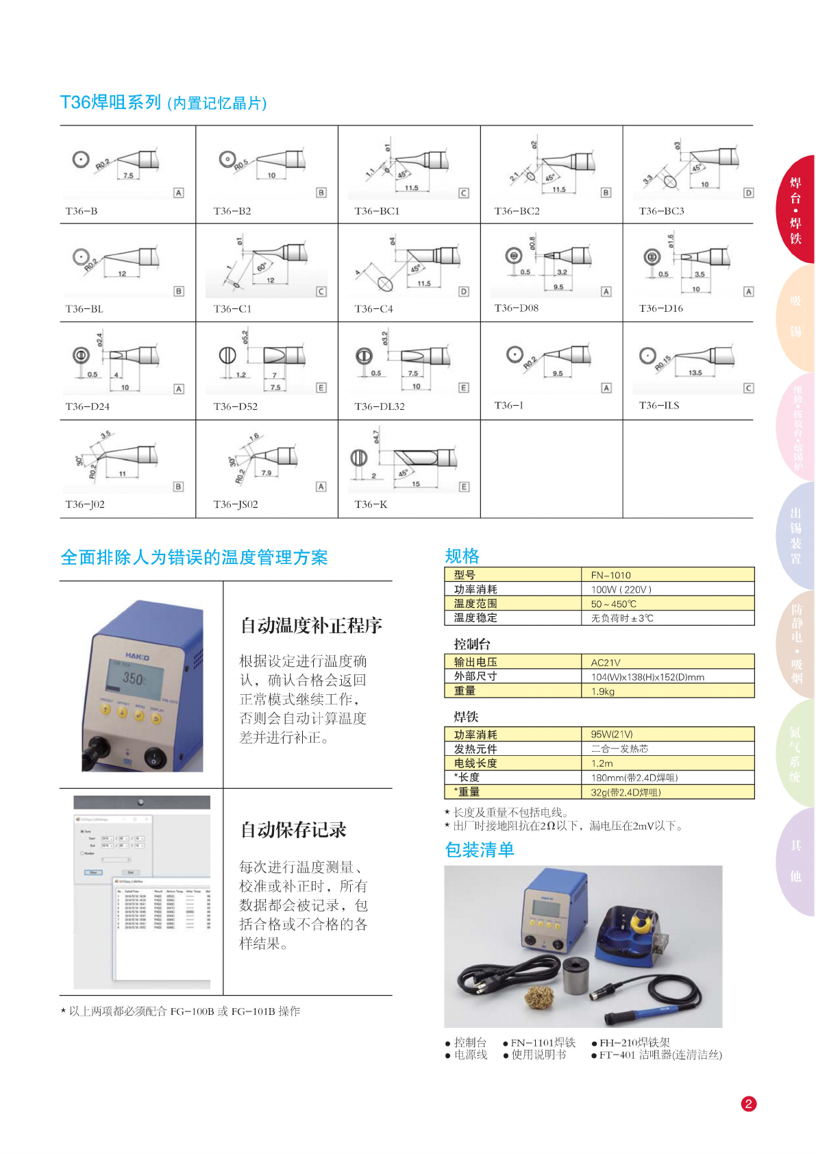 自动保 存记录 每次进 行温度 测量、 校 准或补 正时, 所有 数据 都会被 记录, 包 括合格 或不合 格的各 样 结果。 * 长度 及重 量不包 括电线 。 * 出厂 时接地 阻抗在 2fl 以下, 漏 电压在 2mV 以下。 包 装清单 * 以上 两项都 必须配 FG-100B 或 FG-101B 操作 控 制台 ・ FNT101 焊铁 ♦FH-210 焊铁架 电 源线 •使 用说 明书 ・ FT-401 洁咀器 (连清 洁…
