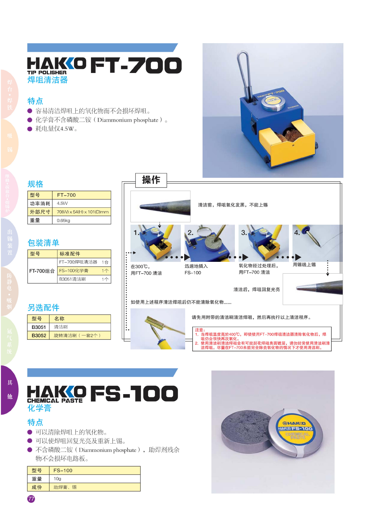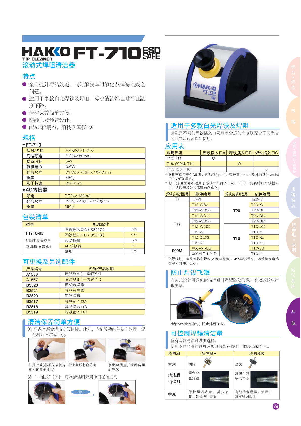慰照。 FT・71 0 疑 滚动 式焊咀 清洁器 特点 • 全面提 升清洁 效能, 同时 解决焊 咀氧化 及焊锡 飞溅之 问题。 • 适 用于多 款白光 焊铁及 焊咀, 减 少清洁 焊咀时 焊咀温 度 下降。 • 清洁保 养简单 方便。 • 防静电 及静音 设计。 • 配 AC 转 接器, 消耗 功率仅 5 W 规格 • FT-71 0 • AC 转接器 型号 / 名称 HAKKO FT-710 马 达额定 DC24V 50mA 功 率…