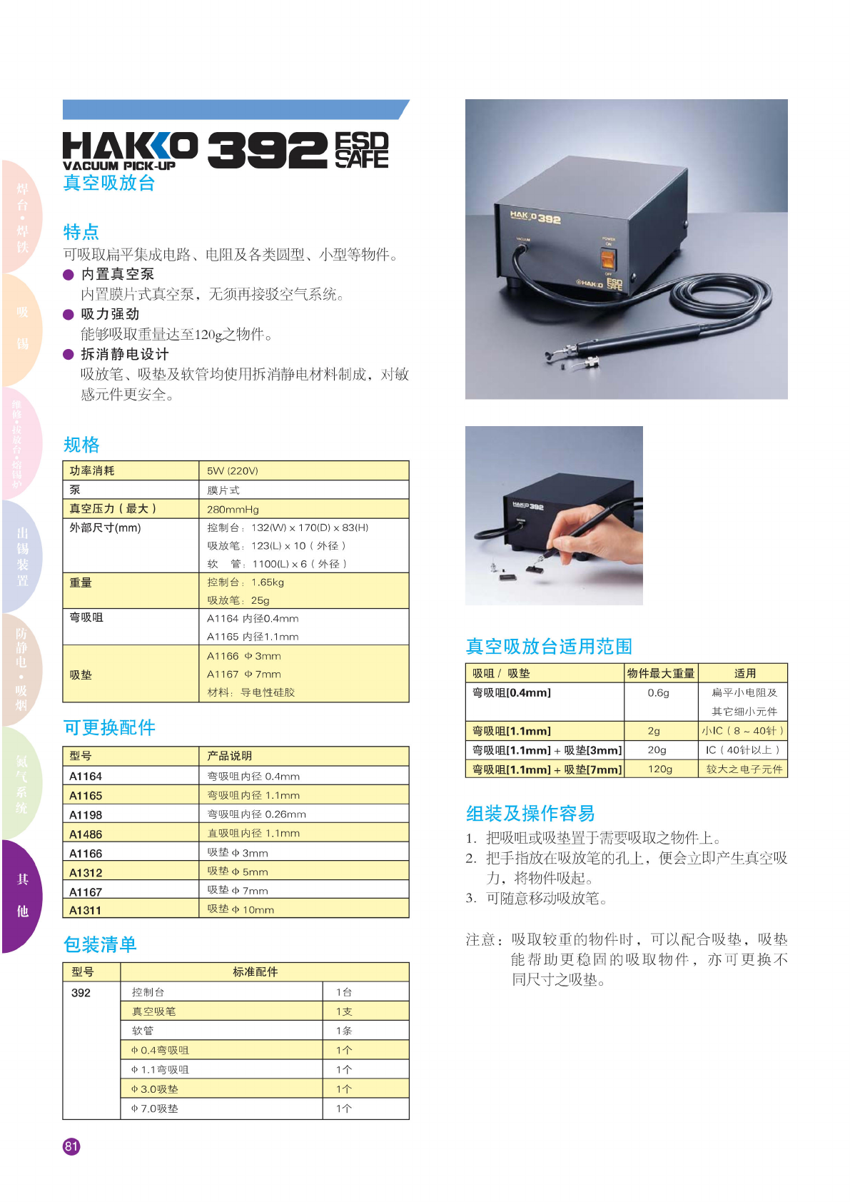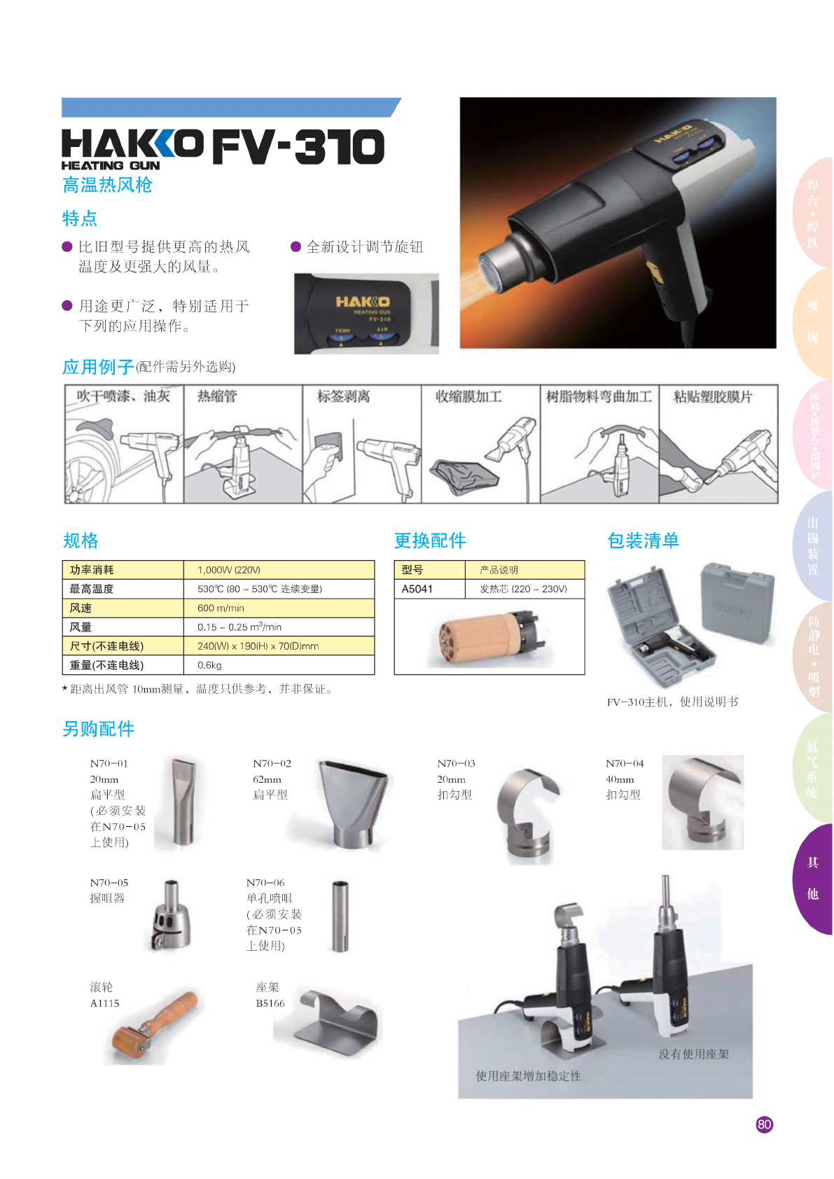 hakcofv-310 HEATING GUN " ' 局温 热风枪 特点 • 比旧 型号提 供更高 的热风 温 度及更 强大的 风量。 •用 途更 广泛, 特别 适用于 下列 的应用 操作。 应 用例子 (配件 需另外 选购) • 全新 设计调 节旋钮 规格 功 率消耗 1,000W(220V) 最局 温度 530℃ (80 ~ 530℃ 连续 变量) 风速 600 m/min 风量 0.15 ~ 0.25 m3/…