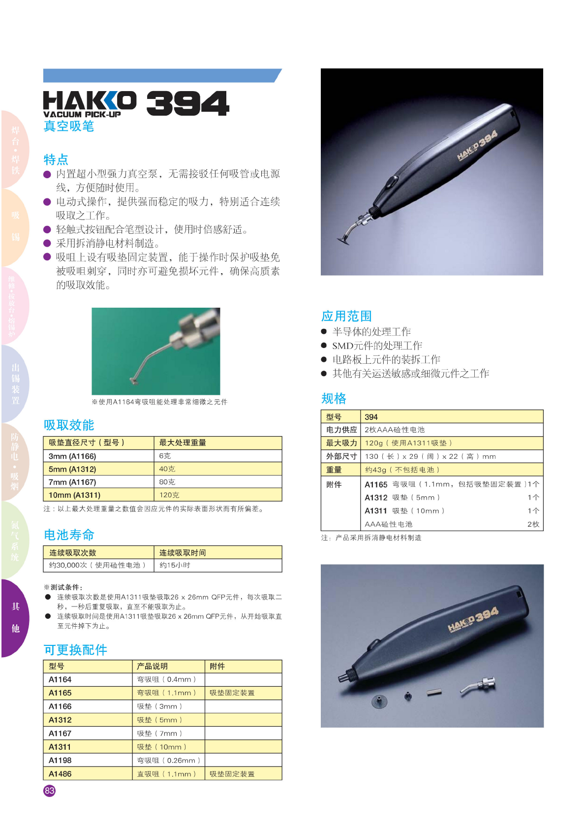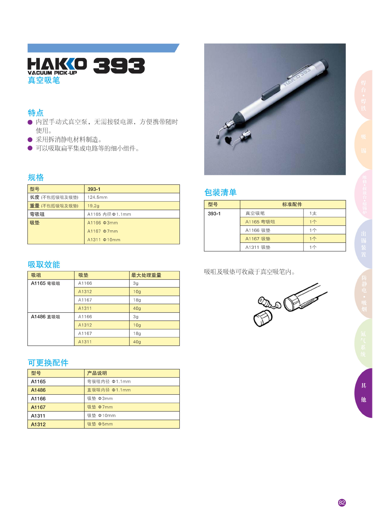 HAKCO 393 VACUUM PICK-UP 真 空吸笔 特点 • 百说手 动式真 空泵, 无 需接驳 电源, 方便携 带随时 使用。 • 采用 拆消静 电材料 制造。 • 可以 吸取扁 平集成 电路等 的细小 蛆件。 规格 型号 393-1 长度 (不 包括 吸咀及 吸垫) 1 24.5mm 重量 (不 包括 吸咀及 吸垫) 19.2g 弯吸咀 Al 165 内径① 1.1 mm 吸垫 A1 1 66 3mm Al 1 67 C …