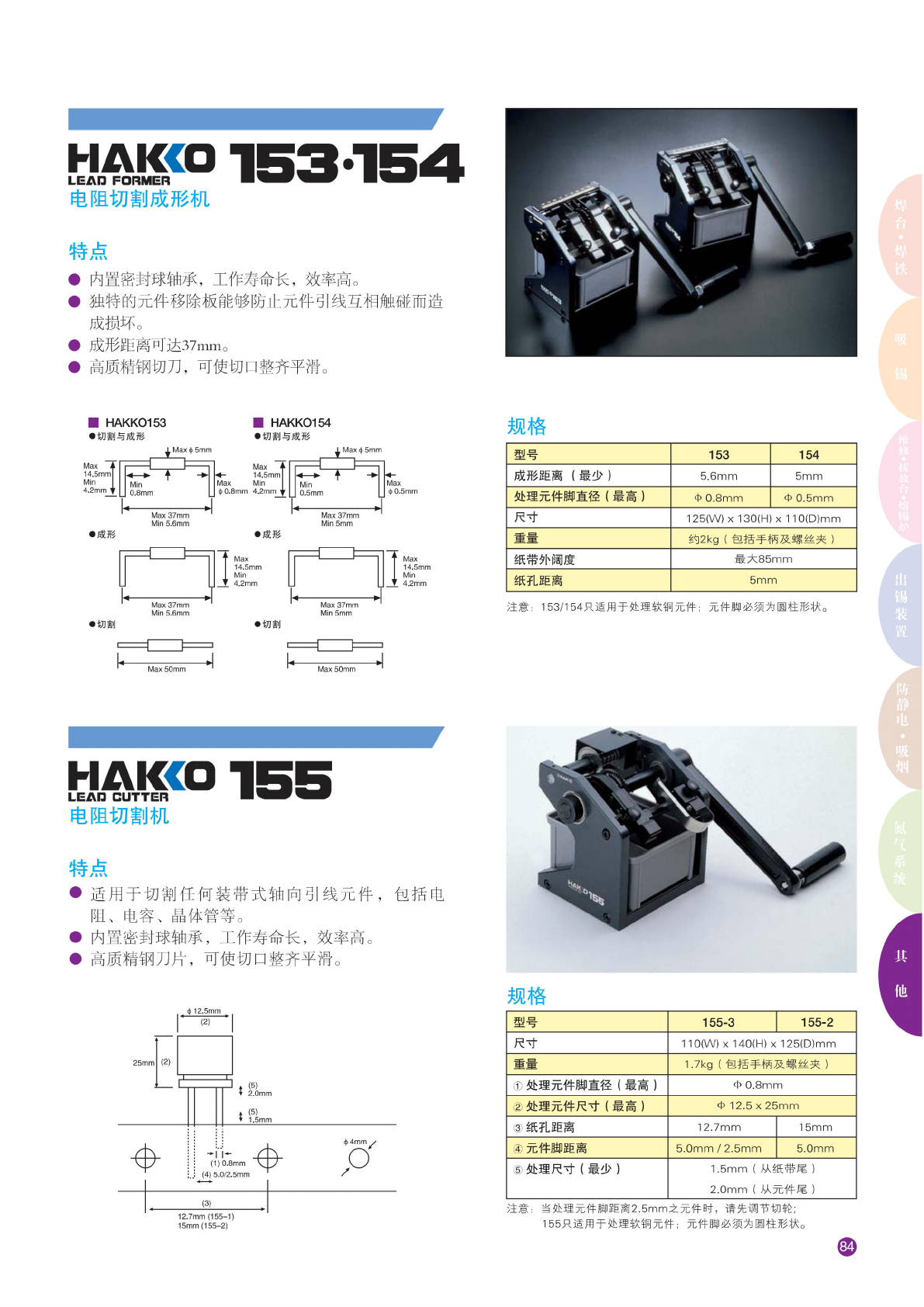 hakco 153-154 LEAD FORMER 电 阻切割 成形机 特点 • 内置 密封球 轴承, 工作寿 命长, 效 率高。 • 独 特的元 件移除 板能够 防止元 件引线 互相触 碰而造 成 损坏。 • 成形距 离可达 37m m。 • 高 质精钢 切刀, 可使切 口整齐 平滑。 HAKKO153 •切割 与成形 HAKKO154 •切割 与成形 Max 6 5mm Max 6 5mm Max 4 ) 0.8mm 4.2mm •…