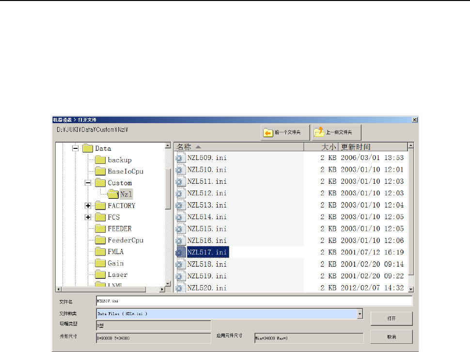 ◇ 选取「机器设置」文件菜单内的「打开吸嘴数据文件」,从 下 述 画面中读取夹持吸嘴信息文件。