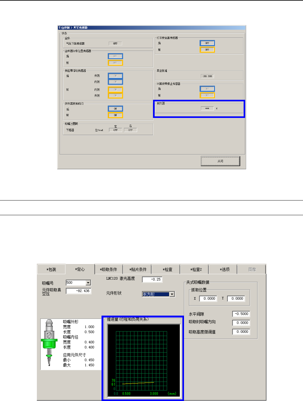 第 2 部 功能详解篇 第 13 章 选项组件 13 - 52 13 -7- 4 手动控制 在手动控制的「 其他传感器 」 - 「 测力器 (g) 」项目里 ,实时地显示测 力器的负荷信息 。 13 -7- 5 编辑程序 13 -7-5- 1 负荷控制设置 选择可进行简易 负荷控制的编号 601 号以上的吸嘴、 以及 标准吸嘴时, 吸取 / 贴片 时的推进量 (行程) 与 负荷值的关系图 表,请见下图。 横轴显示推进量 (行程)的输入 …