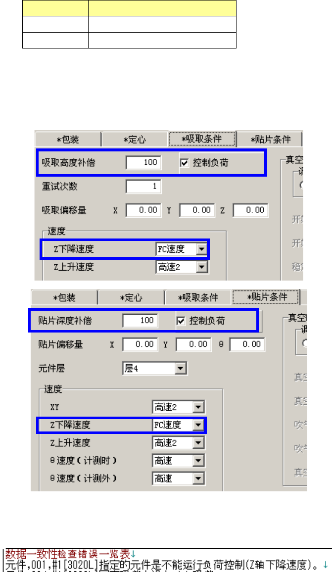 在元件数据中选择负荷控制时,吸取Z轴下降、贴片Z轴下降速度将自动设置为FC速度(Force Contro
