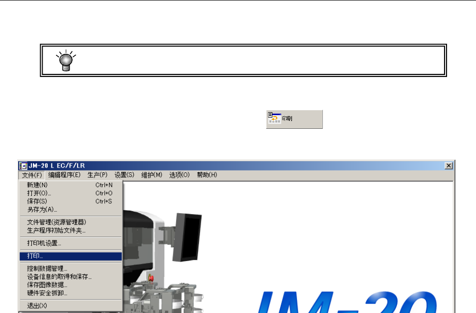 第 1 部 基本篇 第 1 章 装置概要 1- 89 1-9- 8 打印 打印生产管理信息、 装置运行信 息、机器设置状态 、或操作选项内容等 。 可选择打印或输出文 本文件( txt 格式)。 要打印,必须安装打 印驱动程序。 ( 参见 1-9- 7 章 ) (1) 打印步骤 ① 从菜单选择 「 文件 )/ 「 打印」 、或从命令按钮选择 。