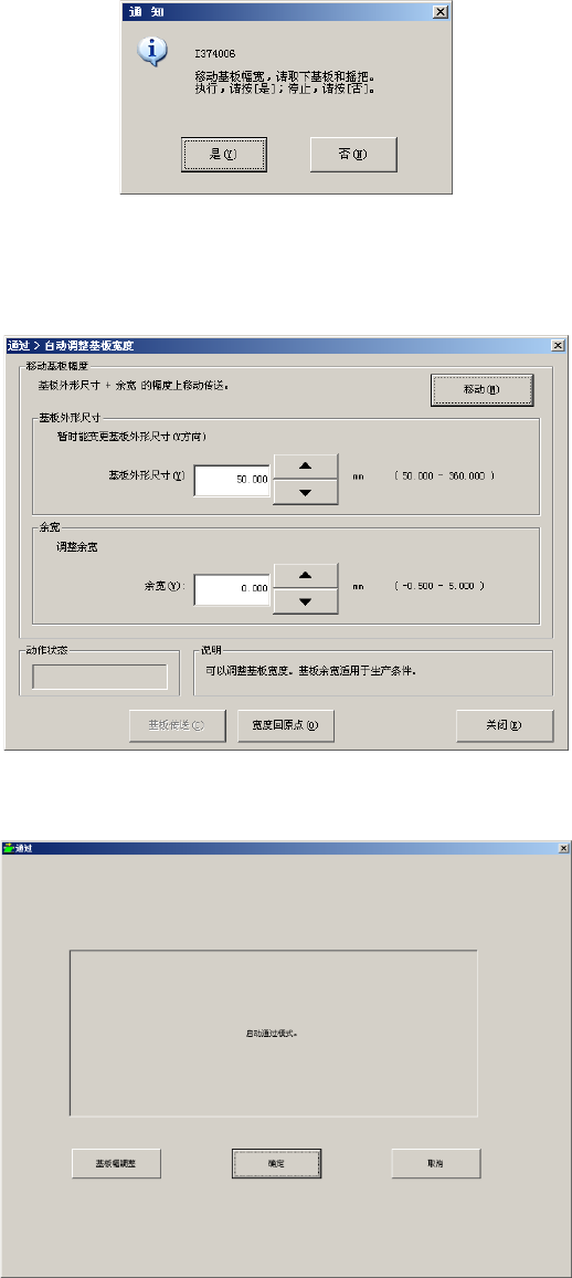 第 1 部 基本篇 第 2 章 生产 2- 21 全轴退避后, 安装 了 自动基板调整 装置 (选购项 ) 时, 显示 「 询问 调整基板宽度提 示信息 」 画面。 选择 [ 是 ] 后,显示 「 自动调整基 板宽度对话框 」 。 按 [ 移动 ] 按钮调整基板幅宽。 调整基板宽度后 ,或在「基板宽 度变更询问信 息」中按下 [ 否 ] ,显示以下 开始 画面。 若点击「 确定 」 ,则显示以下 画面;基 板到达传送的 传感器上时传送 …