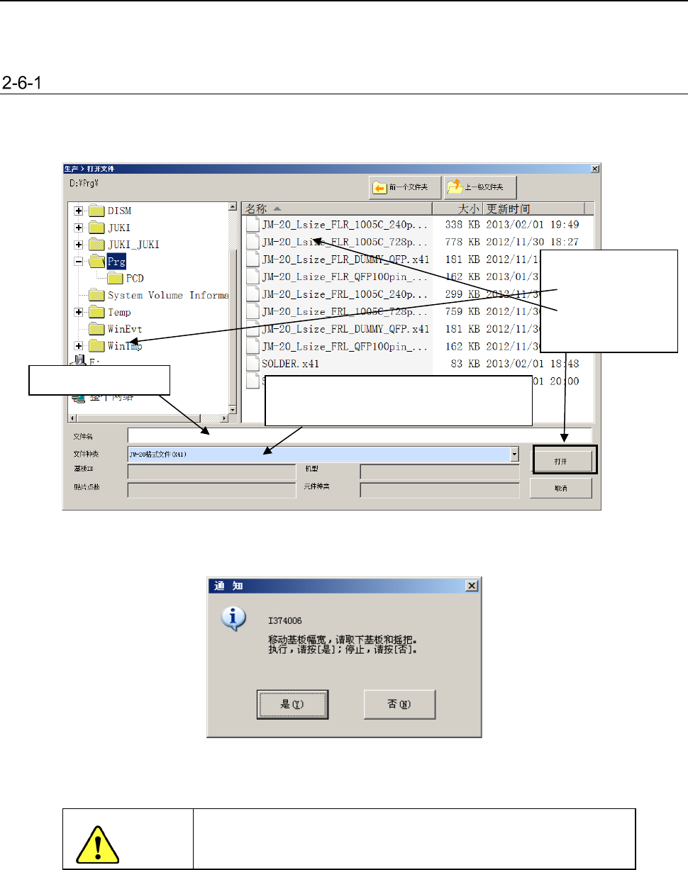第 1 部 基本篇 第 2 章 生产 2- 23 2- 6 文件操作 进行生产时,需 打开生产程序文 件。 此外,在「生产 」画面上改变数 据时或为保存 生产管理信息, 也可保存变更 的数据。 打开(读入文件) 读入已经制作好 的生产程序文件 。 从菜单栏中点击 [ 文件 ]-[ 打开 ] ,则显示如下画面 。 选择文件名,点 击 [ 打开 ], 读入选中的 文件。 安装了自动基板 宽度调整装置( 选购项)时, 接着显示下列信 息: 选…