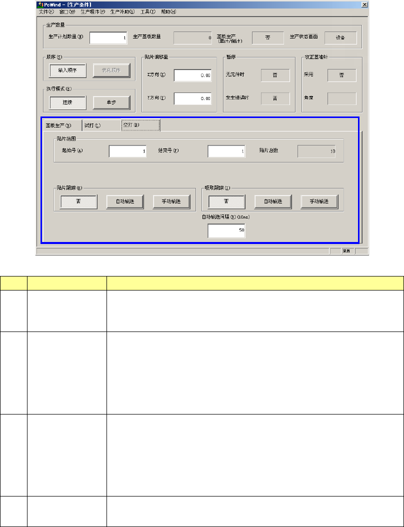 第 1 部 基本篇 第 2 章 生产 2- 51 (3) 空打 No. 项目 内容 1 贴片范围 需限定 贴片范围时, 请输入开始步骤 号和结束步骤 号。 在总贴片 点数项中显示每 1 电 路中的总贴片 步骤号。 仅在设定为输入 顺序时适用。 2 贴片跟踪 设置在空打 基板后,是否 用摄像机进行贴 片点跟踪, 以及跟踪时是自 动输送还是手动 输送。 · 否 :不跟踪。 · 自动输送: 自动跟踪贴片 点。 · 手动输送:在贴片点停下 来,…