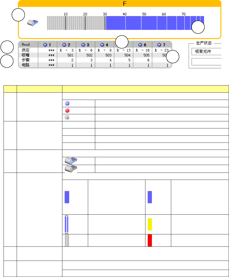 第 1 部 基本篇 第 2 章 生产 2- 58 (2) 显示各 Head 、台架 信息 1) 显示 各 Head 及供料器 台架的状态用图 示符号显示。 2) 图示符号的说明 No 项目 显示 1 Head 显示 Hea d 的使用状态。 He ad 正常使用状态 He ad 错误状态 He ad 未使用状态 2 Head 的信息 供应 显示 Hea d 吸取元件的位 置。 吸嘴 显示 Hea d 安装的吸嘴 号。 步骤 显示元件贴装…