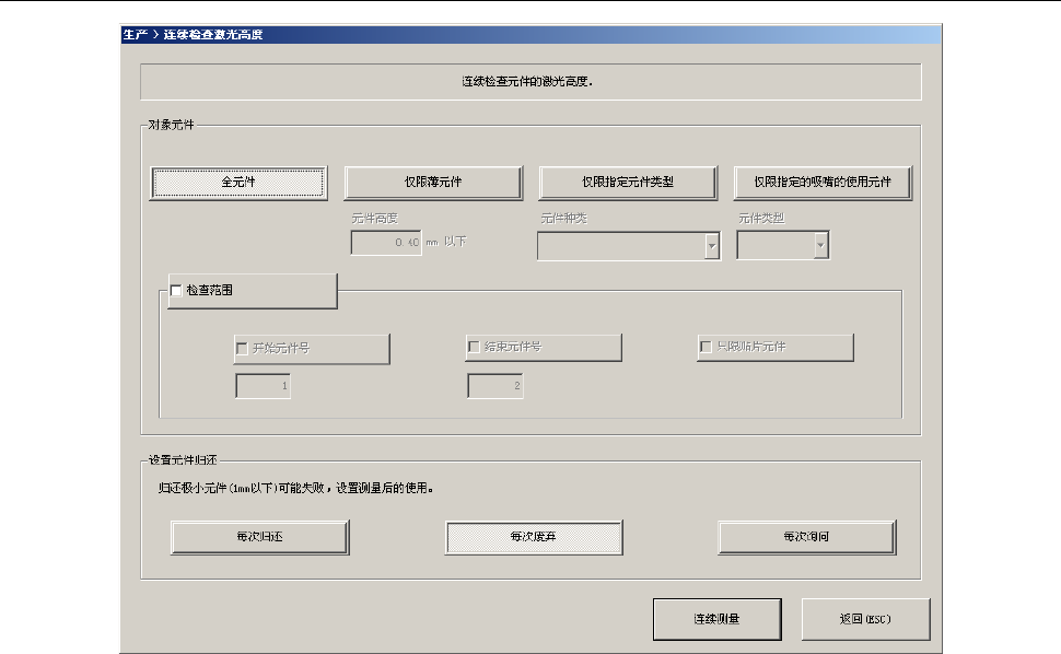 第 1 部 基本篇 第 2 章 生产 2- 125 2- 11 -3- 3 连续检查激光高度 ( 1 )对象元件 只检查元件数据 中某种条件与之 一致的元件时 ,进行此项设定 。 1) 全元件 检查所有的元件 数据。 2) 仅限薄元件 仅对元件高度在 编辑框内的设定 值以下的元件 进行检查。 3) 仅限指定的元件 类型 仅检查组合框里 选择的元件类型 。 4) 仅限指定的吸嘴 的元件 仅对使用组合框 里选择吸嘴的元 件进行检查。