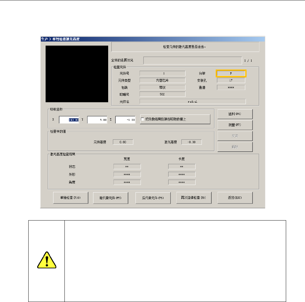 连续检查激光高度中,显示正在进行连续检查激光高度的元件内容/吸取位置/激光高度,依次显示执行
