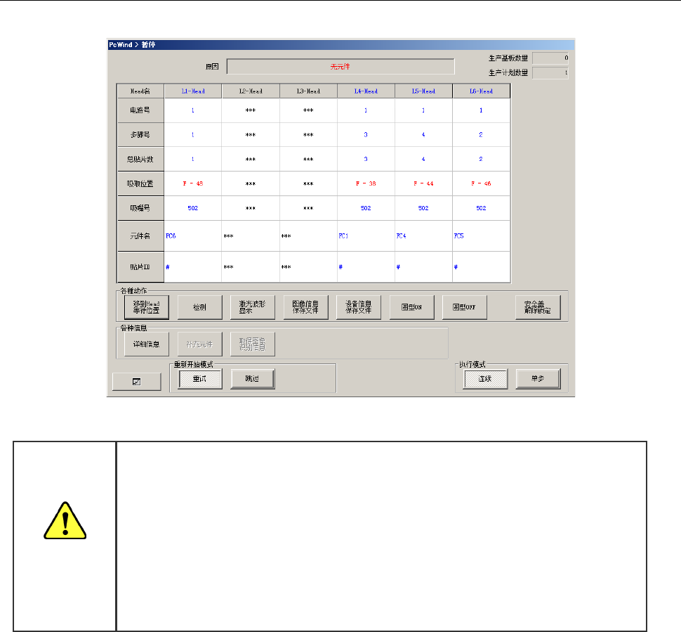 如果勾选了操作选项的[无元件暂停后,重新运行时跟踪吸取]选项,则在重新开始生产前,会显示