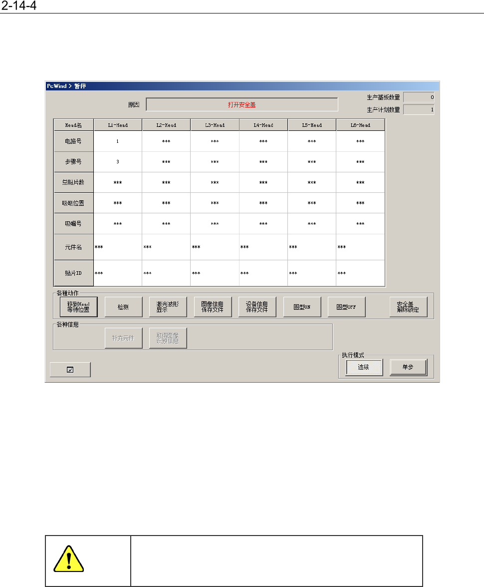 生产中供料器台架下降时,则会暂停生产,显示暂停画面。