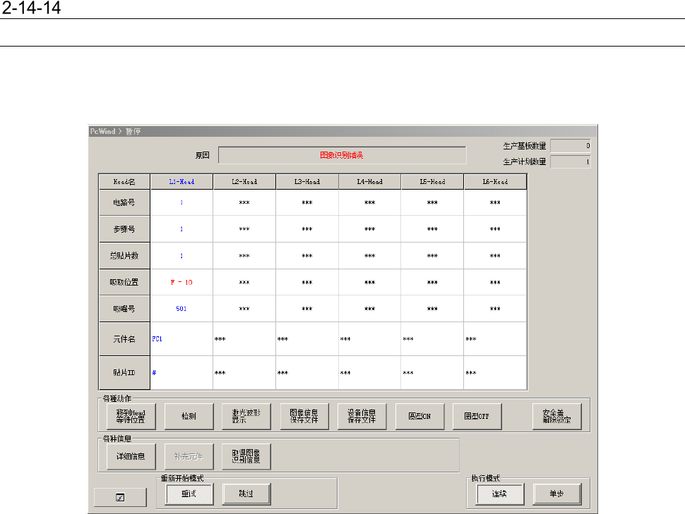 第 1 部 基本篇 第 2 章 生产 2- 185 图像识别异常 2- 14 - 14 - 1 发生图像识别异常 如果在操作选项 – 生产 – 暂停选项中, 勾选了发 生图像识别错误 时暂停, 则在生产中发生 图像识别 异常后,会停止 生产,显示暂停 画面。 在上述画面中, 按下详细信息按 钮,即可打开 错误详细信息画 面。 图像识别异常时 , 会像下图一样 在详细信息对 话框里显示 [图像显示] 、 [前分割屏幕 ] 、 [ 下一 个…