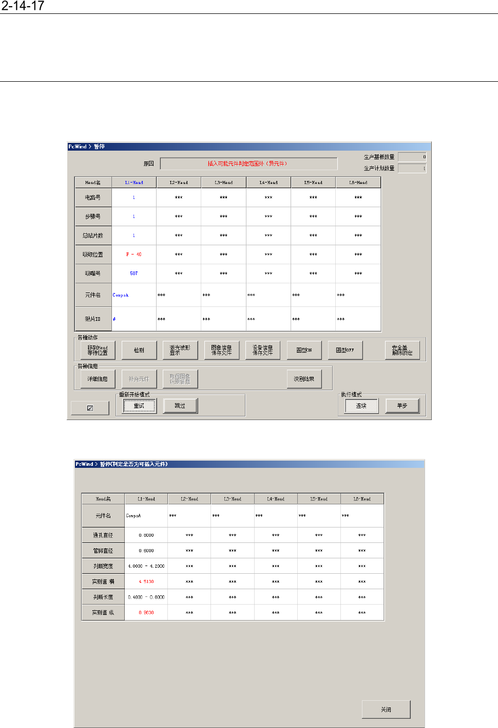 第 1 部 基本篇 第 2 章 生产 2- 193 管脚的长度不同(元件用尽) 勾选了操作选项 – 生产 – 暂停的 「发生 错误时暂停」 时, 在生产中发生管脚 长度不同 ( 元件用尽 ) 时, 停止生产,显示 暂停画面。 元件种类区分为 插入 元件与 INS 电解电容器时, 激光高度为距离 元件管脚下面 1 mm 。 如果将元 件高度错 误设定的过大, 则管脚处于不进 行映射位置的 激光高度。 在该状态下的生 产动作中吸取元 件时,…