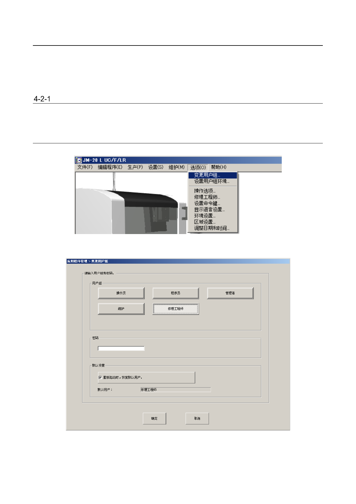 可修改用户级别变更时输入的密码,也可更改默认用户的设置(参见4-2-1-1 变更用户组的“重启动时恢