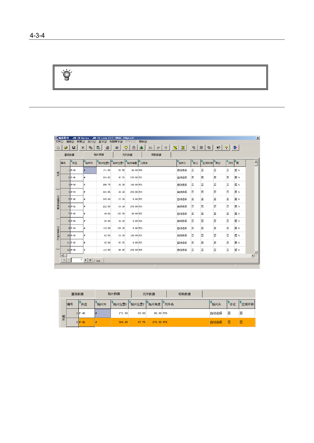 第 1 部 基本篇 第 4 章 制作生产程序 4- 38 贴片数据 输入与贴片元件 的贴片坐标有关 的信息。 多电路板时,输 入相对于 “ 基准电路 ” 的信息。 贴片点数:与单 板基板、多电路 板无关,总点 数最多可输入 10 , 000 点。 4-3-4-1 贴片数据画面的显示 制作基板数据后,单击画面上方的「贴片数据」选项卡,可显示贴片数据制 作画面 ( 下图为制作完成的 示例 ) 。 设置为跳过 ( 包含元件数据的跳 过设置)时…
