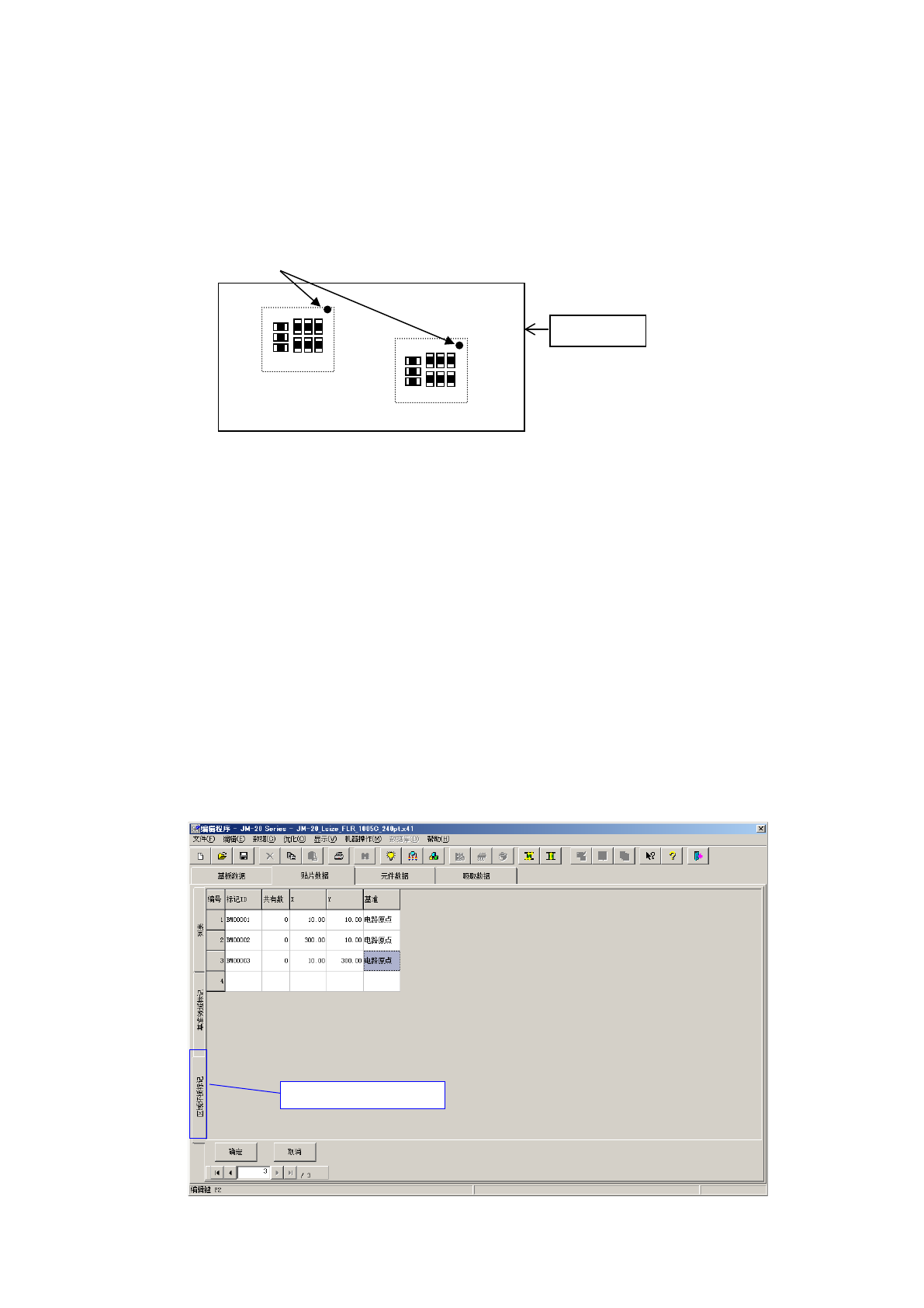 第 1 部 基本篇 第 4 章 制作生产程序 4- 43 「画面显示内容」 · 标记 ID : 输入标记 ID 。最 多可输入 8 个半 角文字。 省略时将自动分 配。 · 共有数 : 显示当 打开区域标记 画面时的,参照 标记群组的贴 片数据点数。 但不能编辑。 · 标记 1(2 , 3 )X : 输 入标记的 X 坐标。 · 标记 1(2 , 3 )Y : 输 入标记的 Y 坐标。 · 标记名 : 输入标 记的名称。 · 标记 1(…