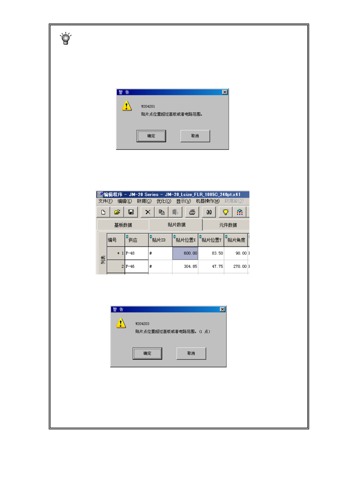 第 1 部 基本篇 第 4 章 制作生产程序 4- 47 范围检查 在下列时间段内,对贴片位置是否在基板内 ( 单板基板时 ) 、或是否在电路内 ( 多电路 板 时 ) 进行检查。 1) 输入数据时 在输入贴 片位置 X 或 Y 时,或分 别进行了改变 时,将进行范围 检查。 出错时,将显示 如下的警告信息 。 ● 确定 => 确定输入数据,在贴片数据 编号的左侧显示超范围标记 “*” ( 参见下 图 ) 。如 果输入范围内的 值…