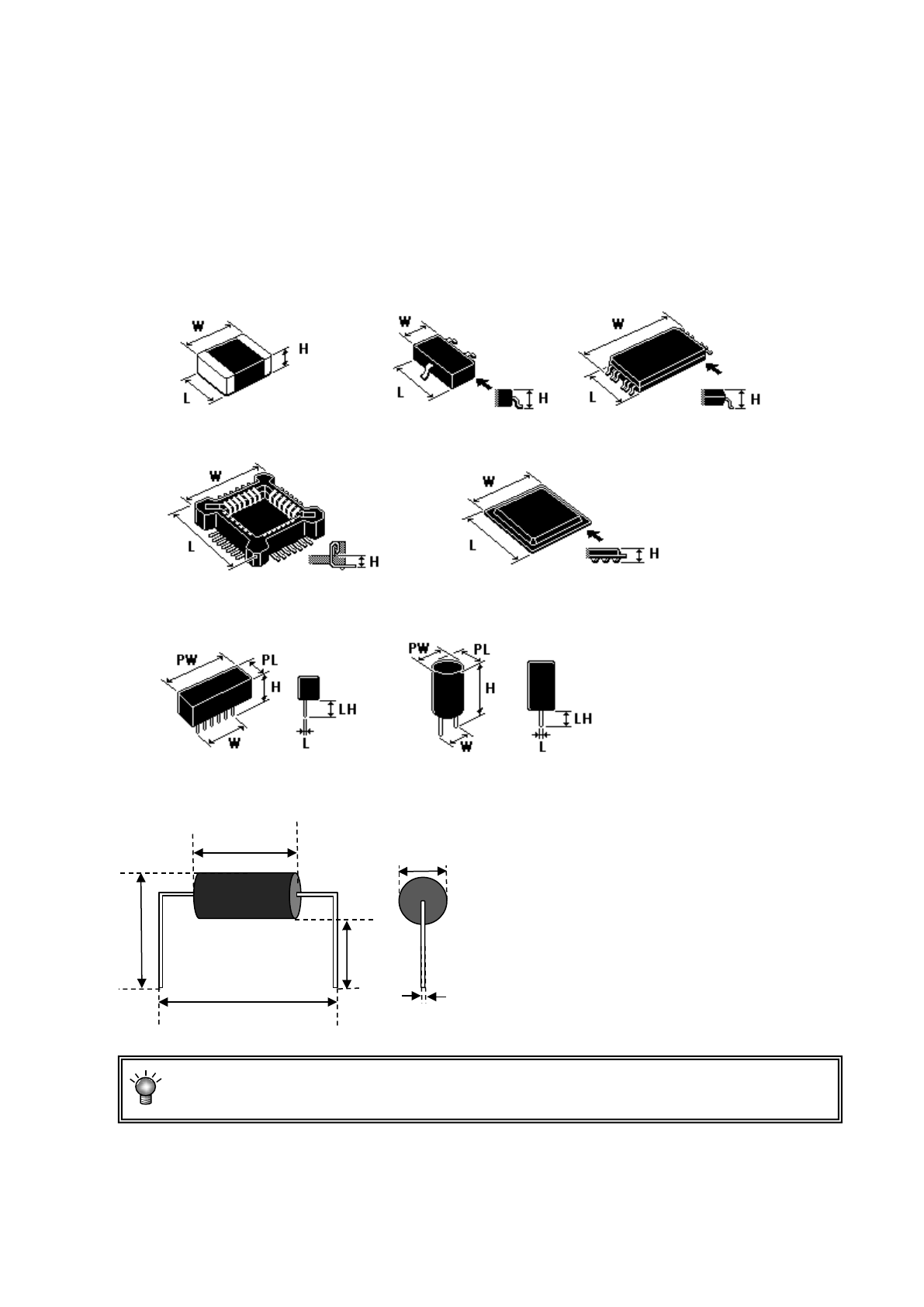 第 1 部 基本篇 第 4 章 制作生产程序 4- 52 (5) 外形尺寸 输入适用于各元 件类型的元件外 形尺寸。 请参考表格画面 左下部显示的元 件图形,进行 输入。 另外请注意,根 据元件类型,有 时「包含」 引脚,有时 「 不包含 」 引脚。 (以 JUKI 元件供应角度 定义 0 ° 为基础的图 形会按照 「 元件 类型 」 进行显示。 ) 例> W = 外形尺寸 横 L = 外形尺寸 纵 H = 元件高度 ◆方形芯片 ◆ S…