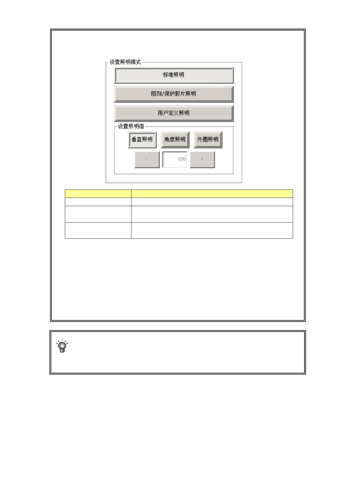※选择用户定义照明模式时,一般设置在50~200之间。设置50 以下时,