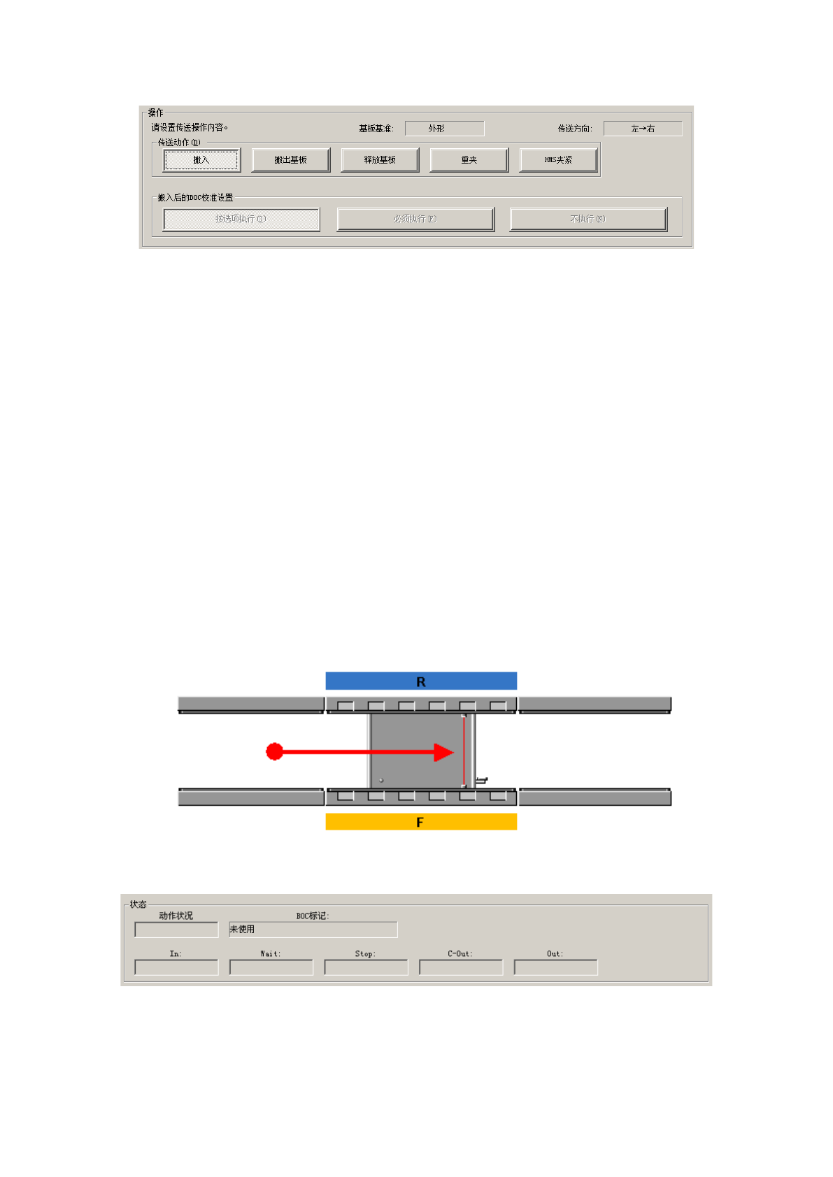 选择传送动作。可选择搬入、搬出基板、释放基板、重夹、HMS 夹紧(L 规格:选购项、XL 规格: