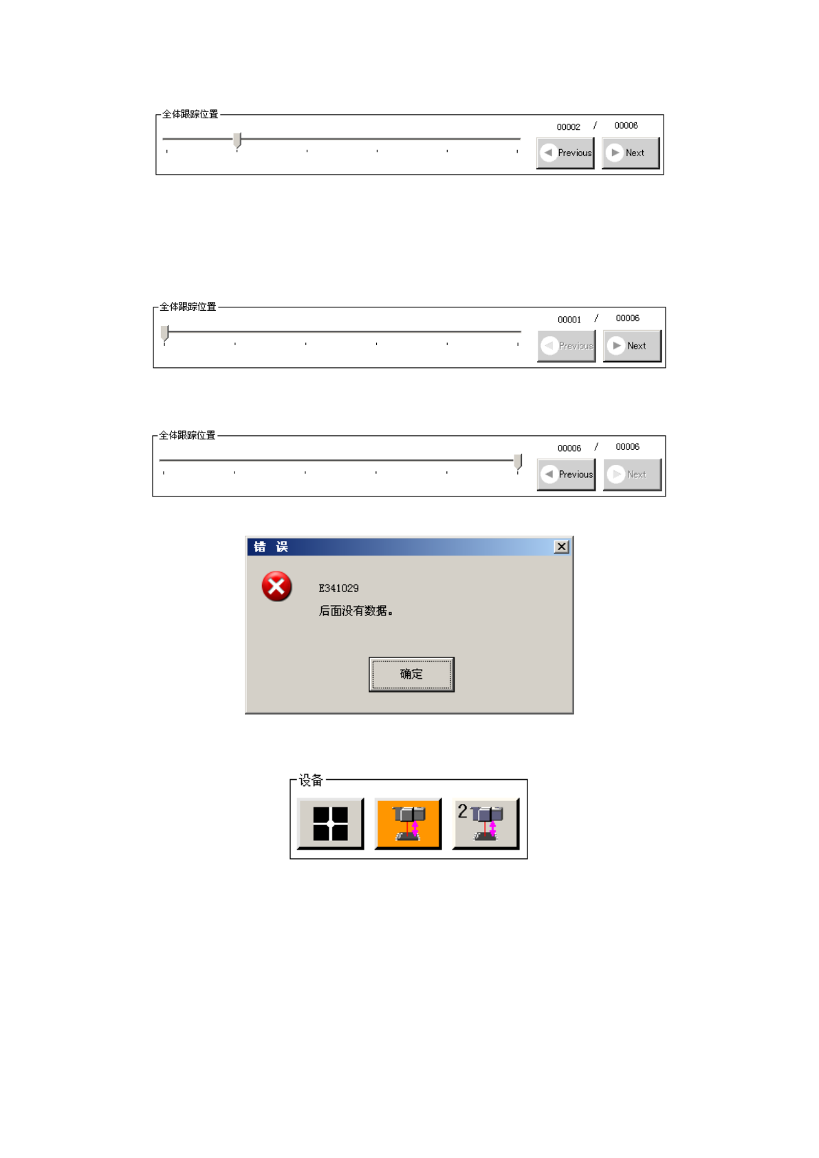 第 1 部 基本篇 第 4 章 制作生产程序 4- 294 5) 全体跟踪位置 跟踪位置会随着进度 一点一点前进。在 停止时,可以通过 自由地移动滑动条 返回到前面、或 推进到后面。另外,按 [ Previous] 按钮会 返回到前一个贴片点, 按 [ Nex t ] 按钮或 < S TA R T > 开关 会移动到下一个 贴片点。 当前面已经没有 数据时,会出现 如下的显示, [ Previous] 按钮失 效。 当后面已…