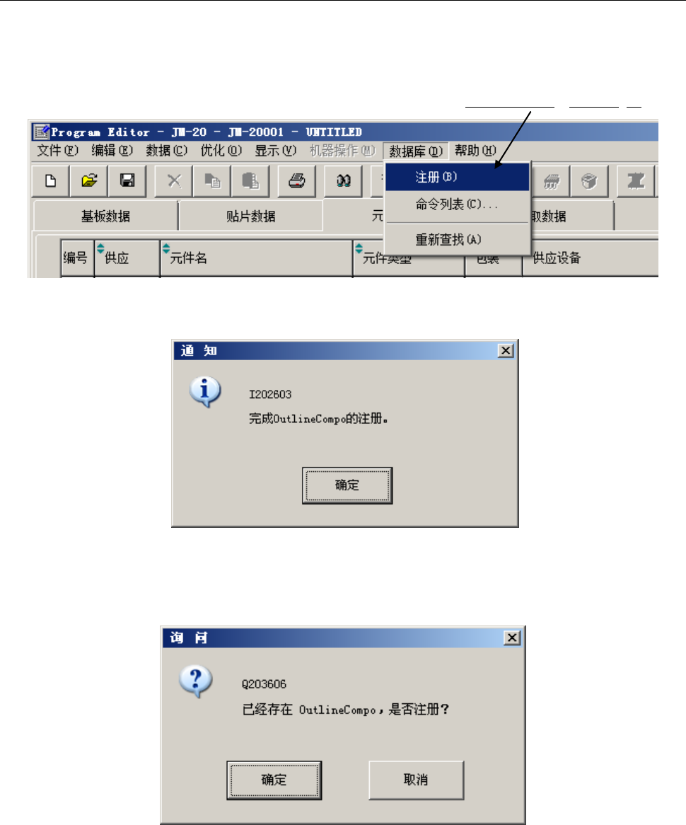 第 1 部 基本篇 第 5 章 数据库 5-4 5-1- 2 注册 从「 编辑程序 」中,逐一注册生 产程序文件的 元件数据。 < 步骤 > ①打开「 编辑程序 」的「元件数据」 。 ②选择要注册的 元件 ( 若是 清单画面,请先 单击元件所在行 ) ,再单击「 数据库 」 - 「 注册 」 。 ③ 显示如下画 面,单击 [ 确定 ] ,即可完成注册 。 已有同名元件注 册时,会显示下 列对话框。 要覆盖元件数据 时请按下 …