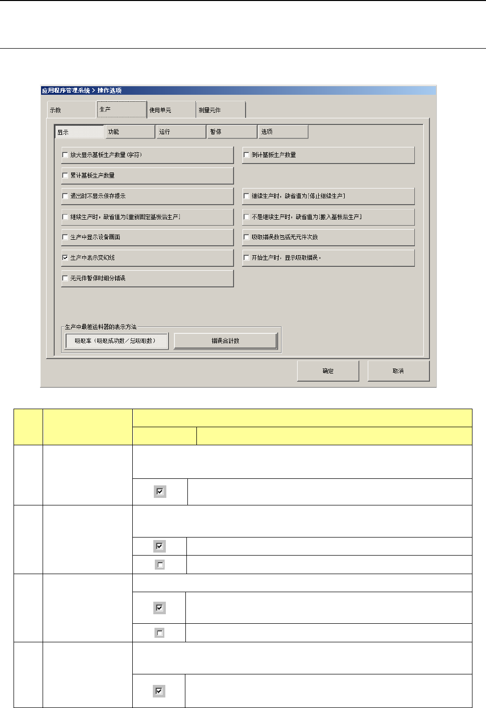 第 2 部 功能详解篇 第 7 章 操作选项 7-5 7- 3 生产 设置生产时处理 的操作选项。 7-3- 1 显示 按下 [ 显示 ] 按钮后,画面 上会显示 “ 生产时显示的 选项设置画面 ” 。 No. 项目 内容 状态 动作及详细内容 1 放大显示基板生 产数量 对是否用大写来显示生 产运行中的基板数 量进行设置。 用大字显示生产 运行中已生产的 基板数量。 2 倒计基板生产数 量 对基板生产数量 的显示方法进行 设置。 显示…