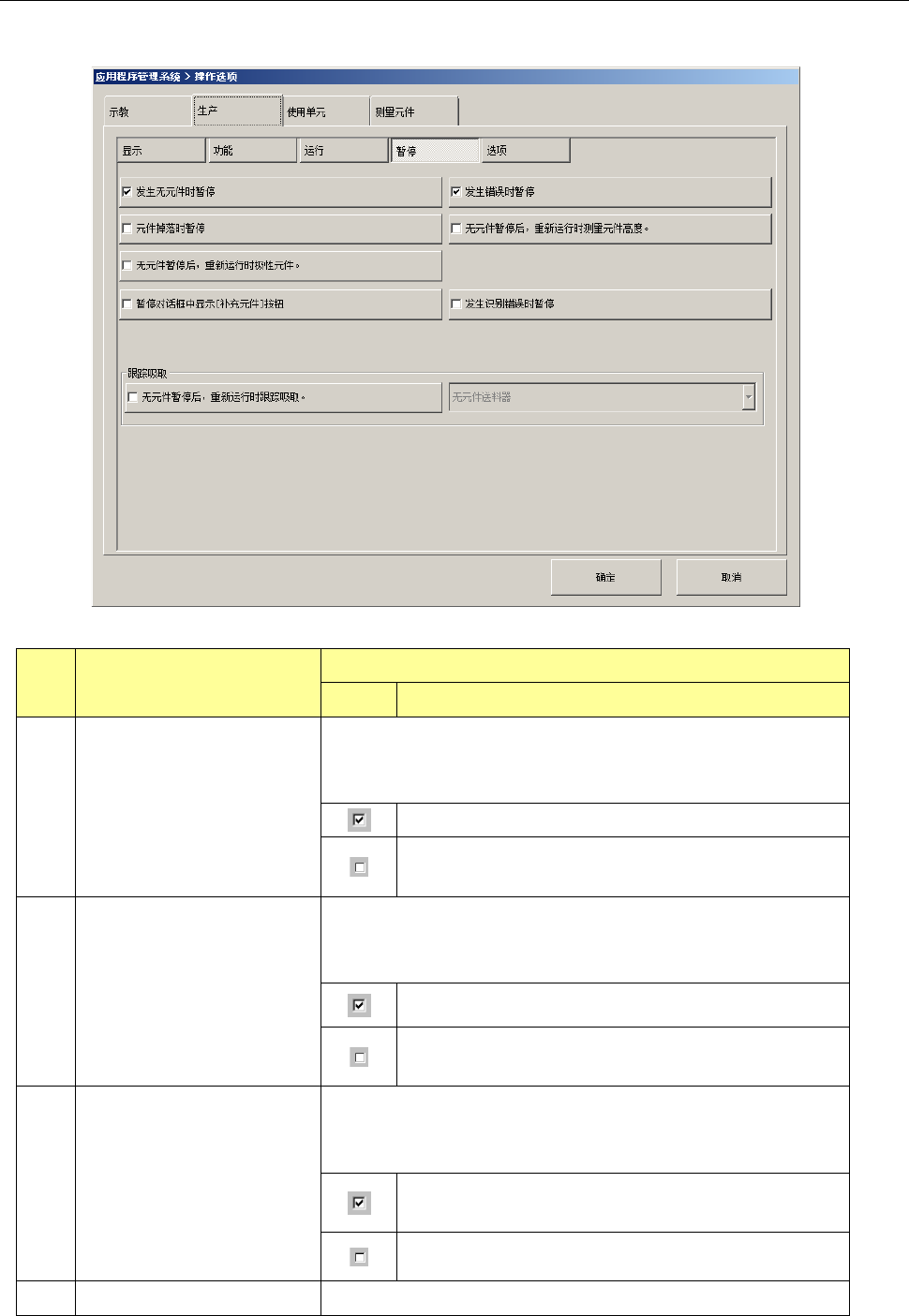 第 2 部 功能详解篇 第 7 章 操作选项 7- 14 7-3- 4 暂停 按下[暂停]按 钮,会显示 “ 生产暂停选项 设置画面 ” 。 No. 项目 内容 状态 动作及详细内容 1 发生无元件时暂停 设置发生元件用 完时的动作模式 。 元件用完时暂停 生产。 生产中即使发生元件用完 ,只要有可贴片的元件, 即继续生产。 2 发生错误时暂停 设置发生错误时 的动作模式。 生产动作发生错 误 ( 包括元 件用完 ) 时,暂停生 产。 …