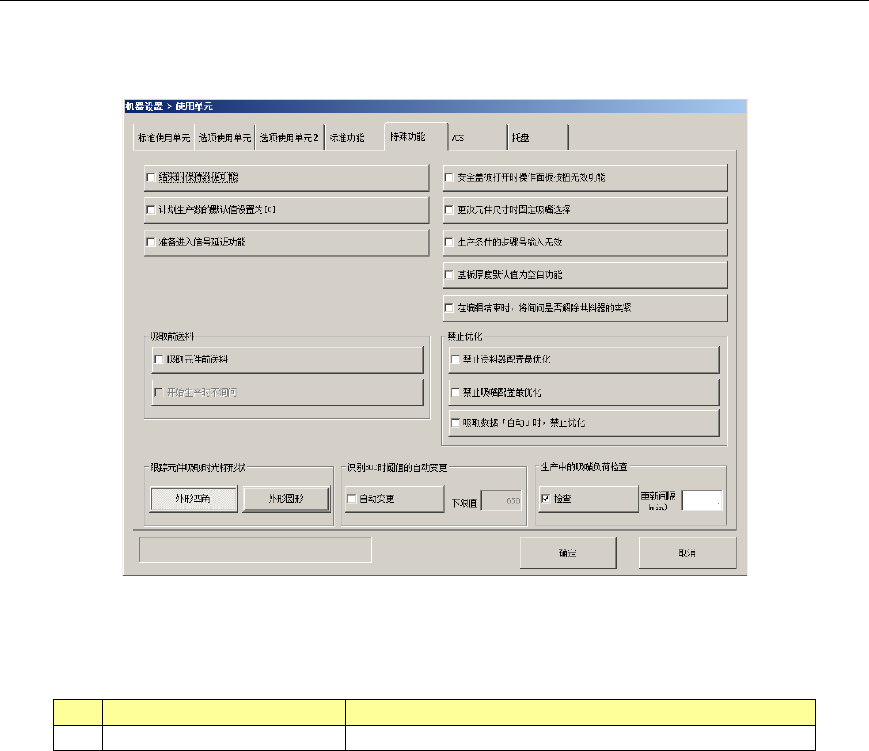 第 2 部 功能详解篇 第 8 章 机器设置 8- 44 (2) 特殊功能的概要 · 特殊功能有 效时的动作内容 No. 项目 功能内容 1 结束时保持数据功能 退出桌面画 面时,保存读 取的生产程序信 息,在下次启 动时恢复生产程 序信息。 2 安全盖被打开时操作 面板 按钮无效功能 打开安全 盖时, 除 S TOP 开关有效之外, 操作面板的 其 他开关为无效。 3 计划生产数的默认值 设置 为 [0] 计划生产数的默 认值设置为 …