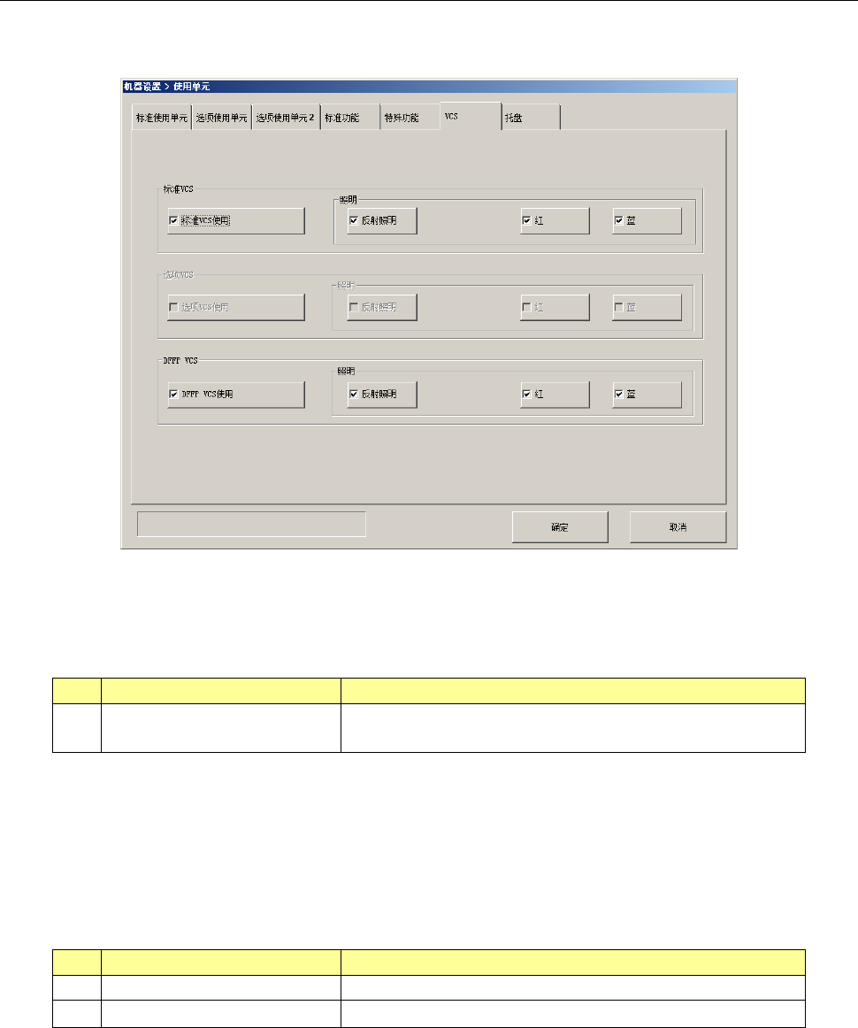第 2 部 功能详解篇 第 8 章 机器设置 8- 46 8-4-9- 6 VCS 选择 [VCS] 选 项卡,即显示以 下的画面。 (1) 设置项目 设置是否使用 VCS 单元。 No. 项目 设置内容 1 使用单元 (VCS) 如果 VCS 单元发生了故 障,在本项目中 将其指定为不 使用单元,即可 不更改生产程序 数据而执行吸 取贴片。 (2) 设置方法 1) 勾选按钮 ,指定要使用 的装置单元。 带勾选标记即设 置为使用,没有 …