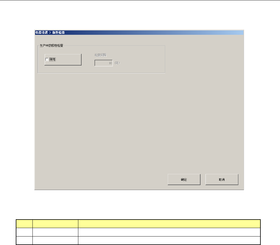 第 2 部 功能详解篇 第 8 章 机器设置 8- 62 8-4- 17 极性检查 ( 选购项 ) 选择极性检查后 ,即显示以下画 面。 设置生产中 的极性检查 。 (1) 设置项目 No. 设置项目 设置内容 1 使用 对生产中 指定的 每块生产基板 ,进行极性检查 。 2 检查间隔 设定生产中进行 极性检查的生产 基板 块数的间隔 。