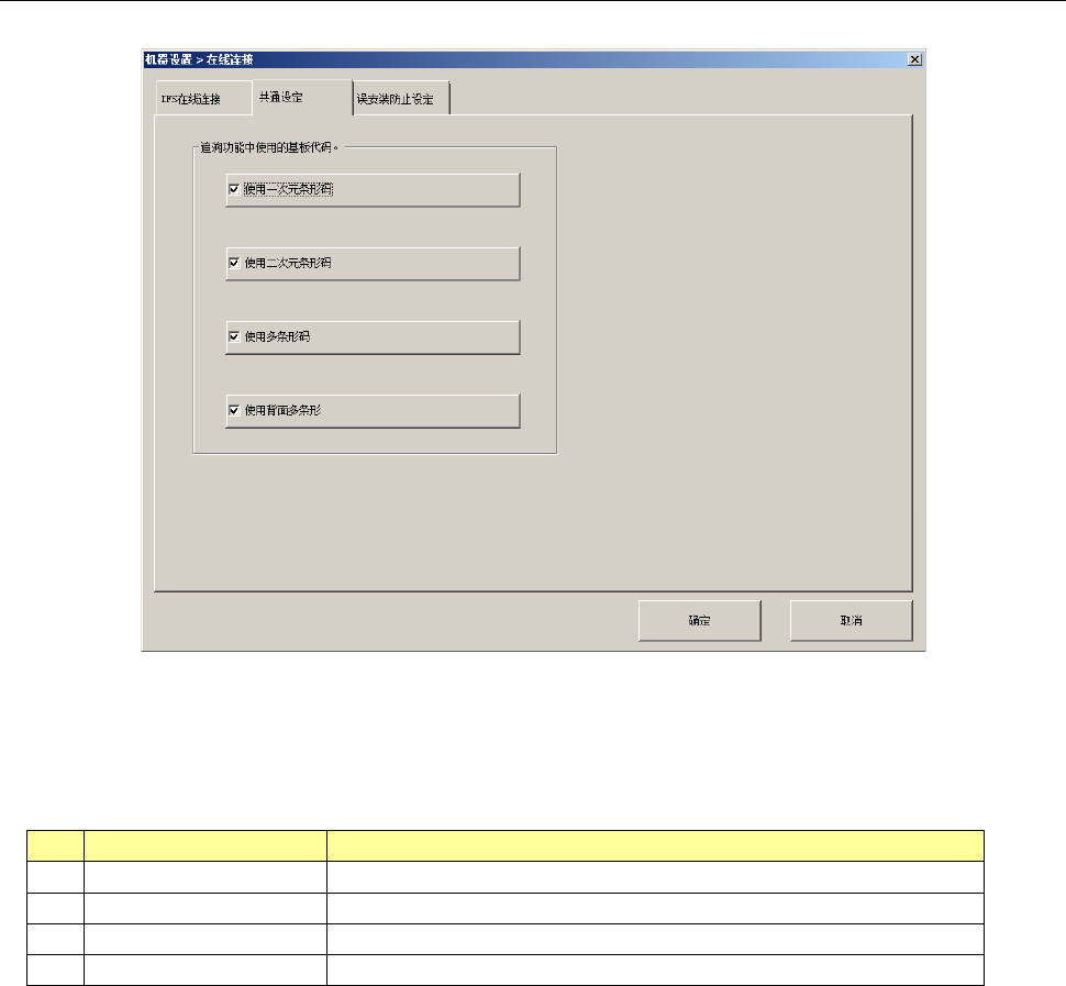 第 2 部 功能详解篇 第 8 章 机器设置 8- 68 8-4- 18 - 5 共通设置 选择 [ 共通设置 ] 选项卡,即显 示以下画面。 (1) 设置项目 选择 使用 的基板代码。 未选择生产管理 系统的误装着防 止功能生产时 ,不能进行选择 。 No. 设置项目 设置内容 1 利用一次元条形 码 在使用一次元条形码 时设置此项。 2 利用二次元条形 码 在使用 二维码 时设置 此项。 3 使用多 条形码 使用多条形码时设置 此项…