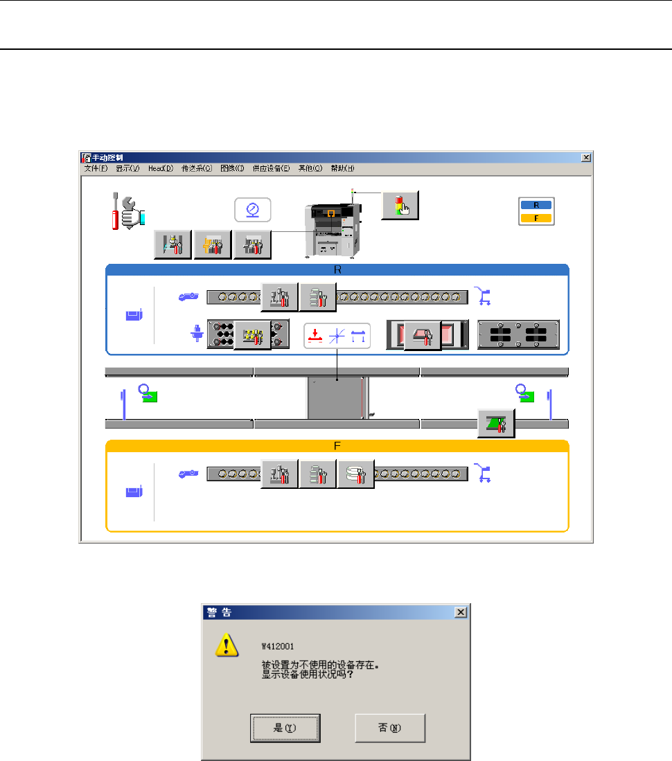 第 2 部 功能详 解篇 第 9 章 手动 控制 9-2 9- 2 手动控制 的启动与退出 9-2- 1 启动手动控制 在菜单栏上点击「设置」 → 「 手动控制」 , 或从画面下方的功能栏点 击「手动控制」 ,画面上会显示 下图所示的手动控制 初始画面。 初始画面内显示各单 元的构成图。点击 画面上设置的 按钮,可启动与各按 钮相对应的设置画 面。 机器设置中有被设置 为不使用的设备时 ,会出现如 下信息。 点击 [ 是 ] ,或 在 …