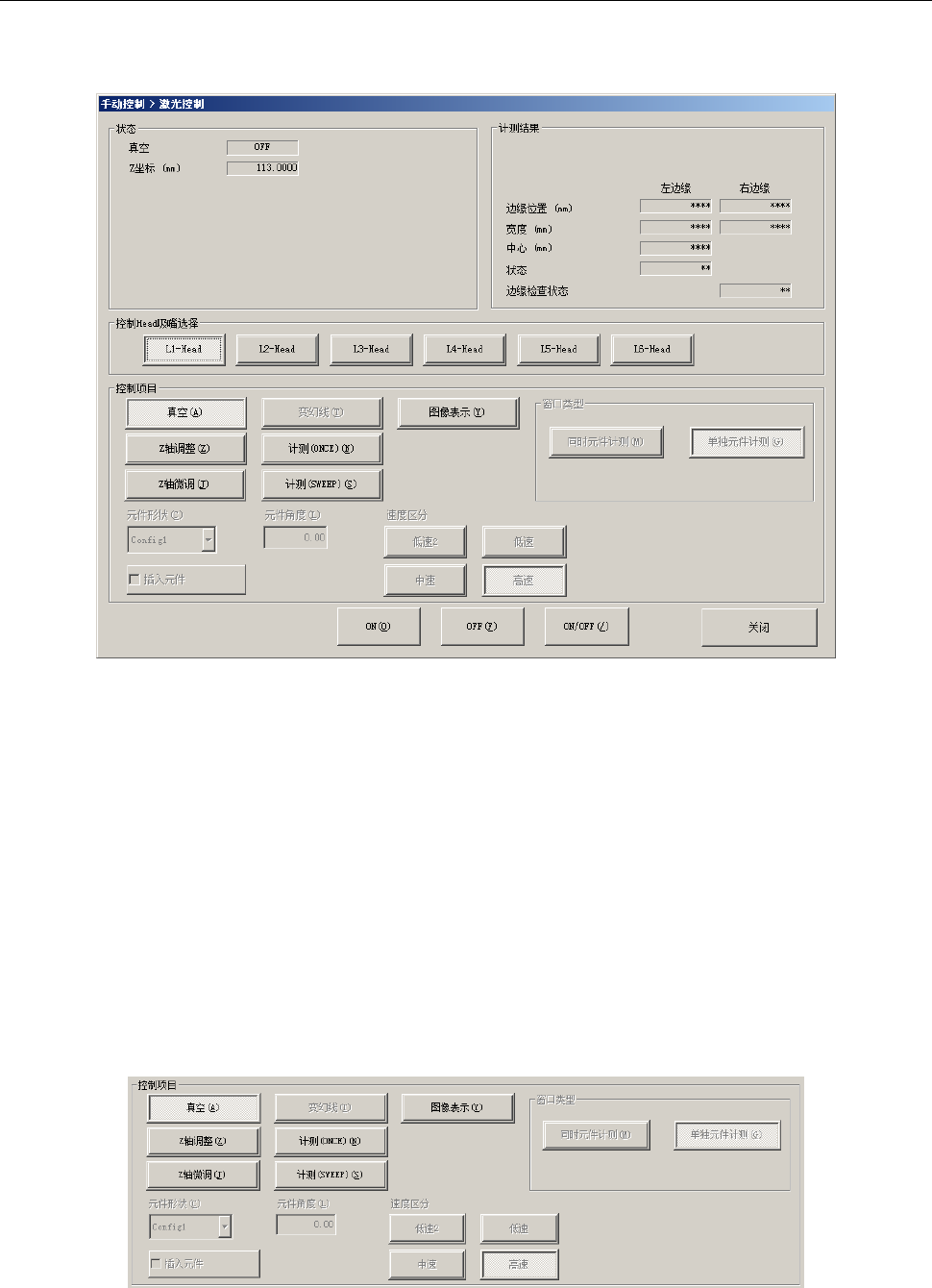 从下拉菜单中选择[Head(D)]-[激光控制(L)]或选择命令按钮的[激光/传感器控制],显示如下的激光/