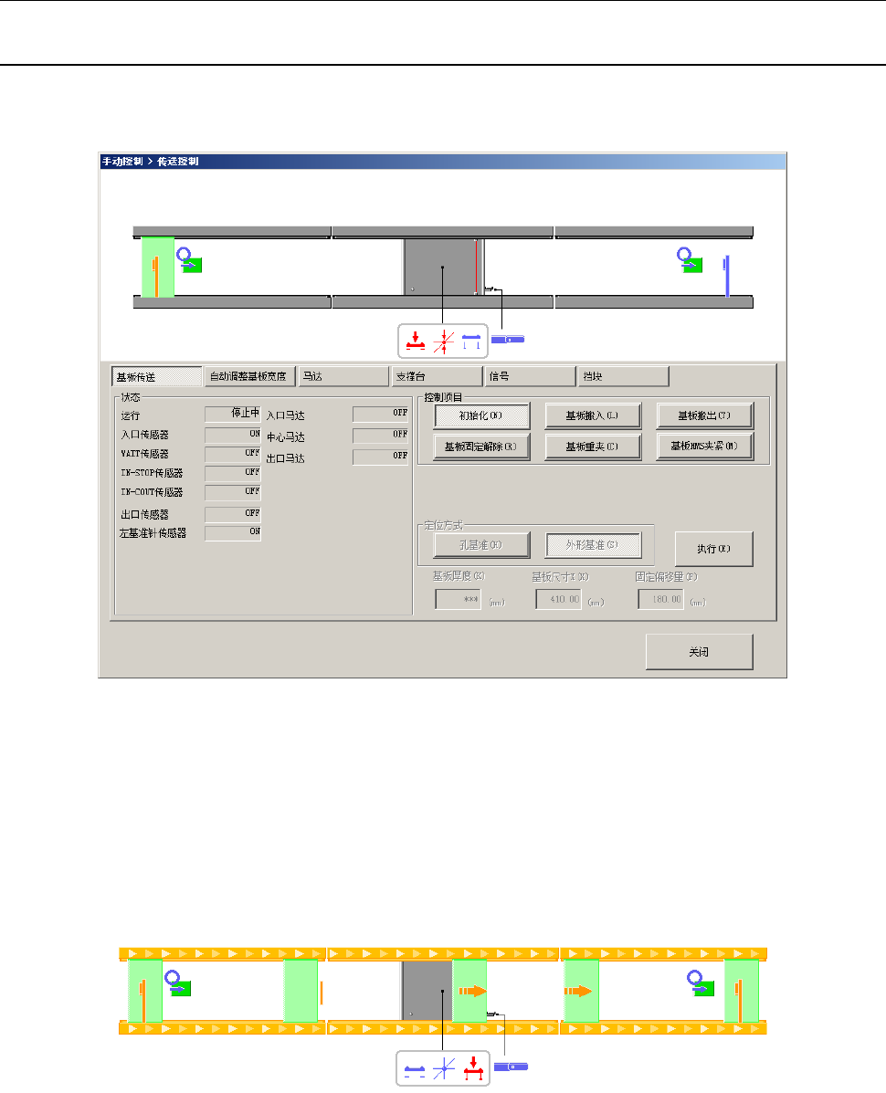 画面上部用形象图显示传送马达、传送传感器的当前的状态(参见(1)传送传感器)。