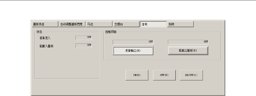 第 2 部 功能详 解篇 第 9 章 手动 控制 9- 30 9-5- 1 - 5 控制对象:信号 按下 [ 信号 ] 按钮, 会显示如下画面 。 (1) 状态 显示传感器的状态。 (2) 控制项目 选择准备输出、或能 搬出基板。 (3) [ON] 、 [OF F] 、 [ON/OFF] 按钮 对所选择的控制项目 信号,进行 [ON] 、 [OFF] 控制 。 也可使用 [ F3 ] 键、 [ F4 ] 键、 [F5] 键。