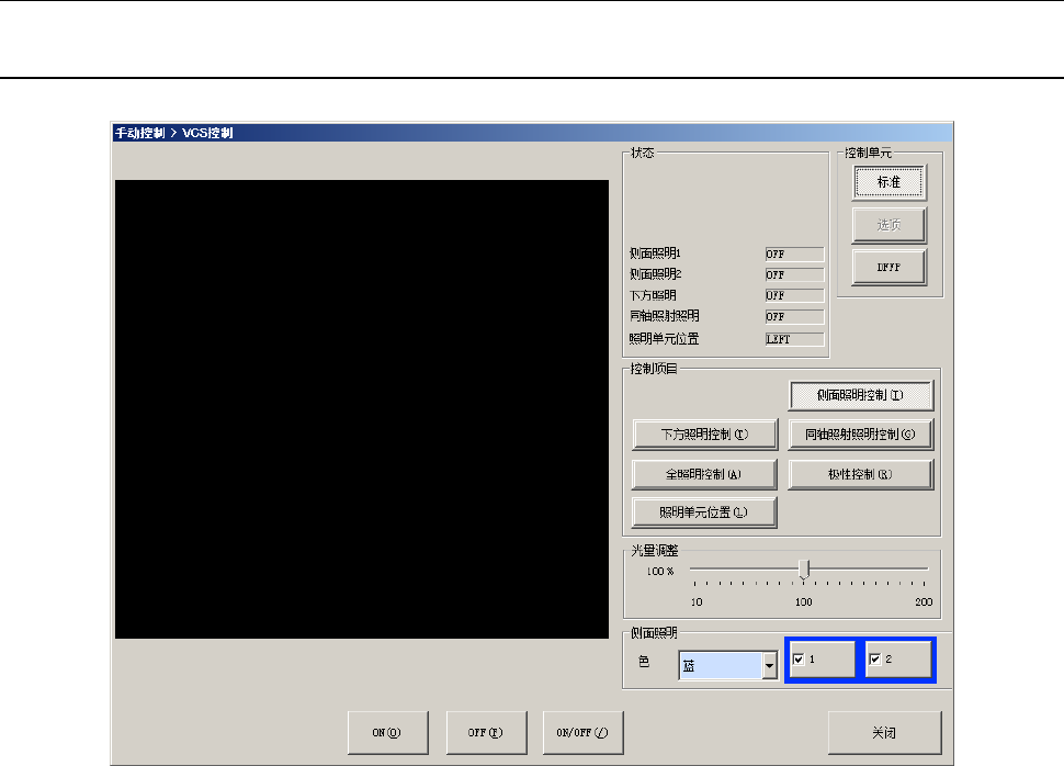 第 2 部 功能详 解篇 第 9 章 手动 控制 9- 35 (4) 控制项目 用单选按钮选择控制 项目。 各项照明控制,可选择 [ON(O)] 、 [OFF(F)] 、 [ON/OFF(/) ] 按钮,或按 [ F3 ] 键、 [ F4 ] 键、 [ F5 ] 键进 行控制。 1 ) 侧面照明 控制 控制侧面照明的 ON/OFF 。 2) 下方照明控制 控制下方 照明 的 ON/OFF 。 3 ) 同轴照射 照明控制 控制同轴照射照明…