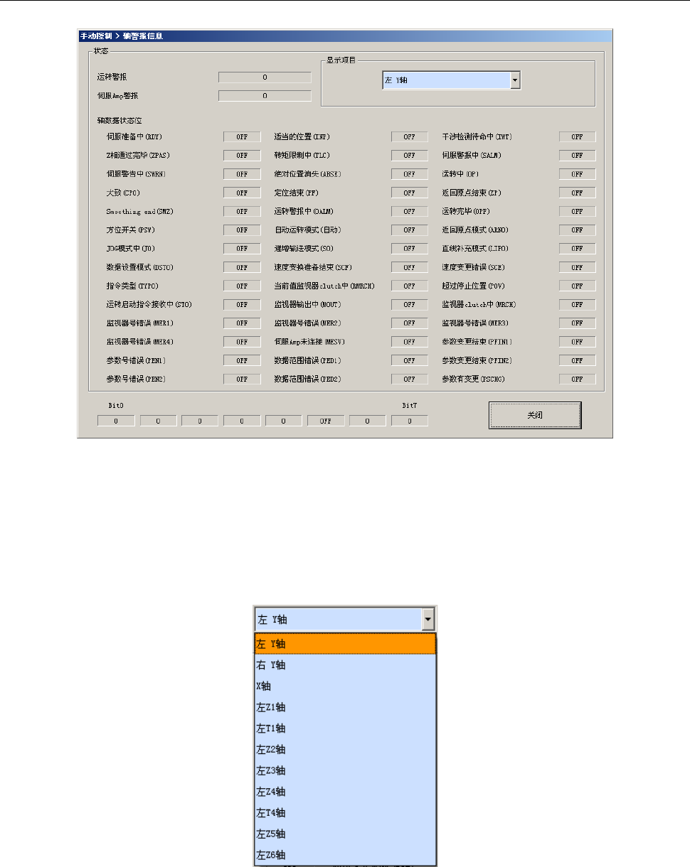 第 2 部 功能详 解篇 第 9 章 手动 控制 9- 54 9-9- 6 - 2 警报信息:轴警报信息 按下 [ 轴警报信 息 ] 按钮后,会显示 如下画面。 (1) 状态 显示警报号码、及各 种状态位的 ON / OF F 状态 。 (2) 显示项目 单击组合框、或在光 标对准组合框上的 状态下按下 [ Al t] +[↓] 键时,选择显示项目 。